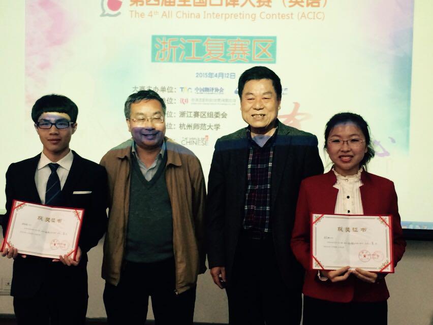 第四届中译杯全国口译大赛浙江省复赛4月12日在杭州师范大学仓前校区举行。来自浙江省各大高校和高职院校94名选手同台竞技,展开激烈竞争,探花 沈佳伟同学表现突出,力挫群雄,获得冠军。沈同学将代表浙江省参加该项赛事的华东区赛。另外探花 钱玲丽同学获得三等奖。