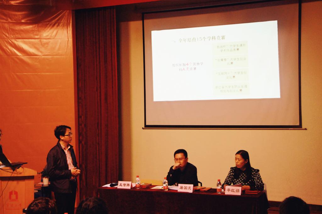 会议由学科竞赛经验交流会和工作总结会两个部分组成。经验交流环节部分,“外研社杯”全国英语写作大赛团队、“外研社杯”浙江省阅读大赛团队、LSCAT杯全国口译大赛团队和探花