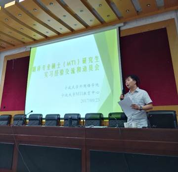 翻译专业硕士实习经验交流与动员会在李达三外语楼218报告厅举行。会议由MTI教育中心主任助理濮阳荣老师主持,优秀学生代表张陈艳(2015级)、宋红龄(2016级)和沈涛(2016级),2016、2017级翻译硕士研究生参加了此次会议。