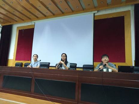 张陈艳同学认为自己研一时的学生会经历让她受益匪浅、对此后的各类高质量翻译实践很有帮助,另外在中国外文局的实习过程中深受锻炼、坚定了自己作为宁大学子的自信,最后还详细介绍了目前在中东欧博览会组委会办公室的实习经历。宋红龄同学介绍了自己如何积极主动抓住各类高质量(翻译)志愿者活动机会,从大学四年级开始就已参加政府高层次外事翻译,并通过同学资源深度参与The Chairman’s Bao等新闻编译以及宁波周边各类企事业单位的翻译任务;她还特别强调时刻注意提高自身水平和全方位素质、做一个有准备的人。沈涛同学作为学院研究生会的现任成员,同大家分享了MTI学长学姐们目前的实习情况,结合自身翻译实践和个人求职经历特别说明了新媒体和专业知识(医药卫生)在翻译实践中的运用体会,最后他还和同学们交流了目前学院研会创办的翻译公司运作情况并热忱欢迎大家共同参与、实现翻译的创业创新梦。