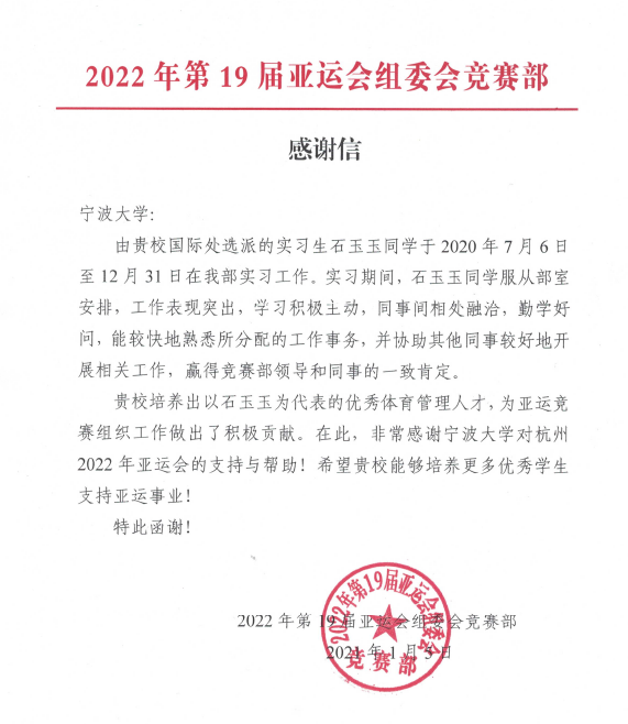 感谢信中写道:石玉玉同学于2020年7月6日至12月31日在亚组委竞赛部实习期间,服从部室安排,工作表现突出,学习积极主动,同事间相处融洽,赢得竞赛部领导和同事的一致肯定。信中还提出“贵校培养出以石玉玉为代表的优秀体育管理人才,为亚运竞赛组织工作做出了积极贡献。非常感谢探花