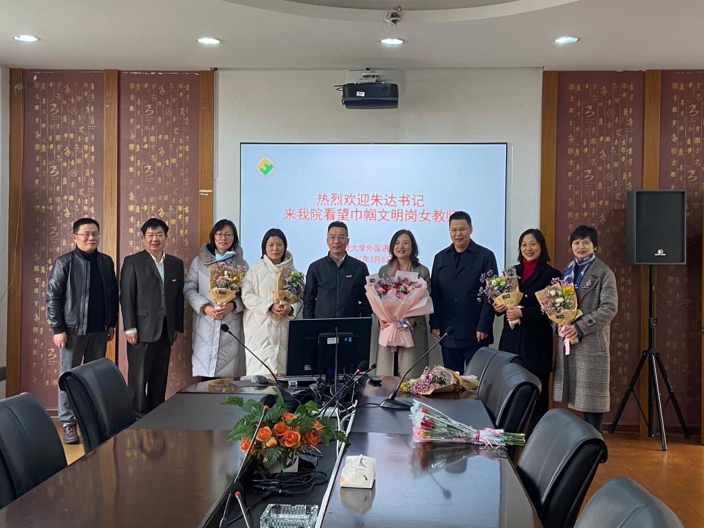 在第98个国际妇女节到来之际,3月8日下午,校党委书记朱达,副校长赵全军,党委委员、工会主席邹日强一行来到全国“巾帼文明岗”所在单位——探花 大外部,向女教师们送来节日问候。探花 负责人介绍了大外部团队基本情况,大外部现有教师49位,其中女性教师41位,是名副其实的巾帼建功单位。