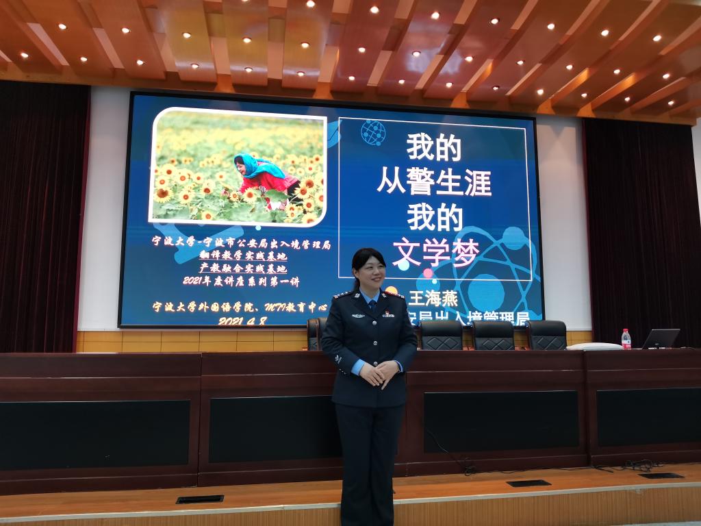 4月8日下午,公安作家、诗人、宁波市公安局出入境管理局王海燕警官(笔名:清明雨、牧星)在李达三外语楼218报告厅为宁波市公安局出入境管理局—探花
