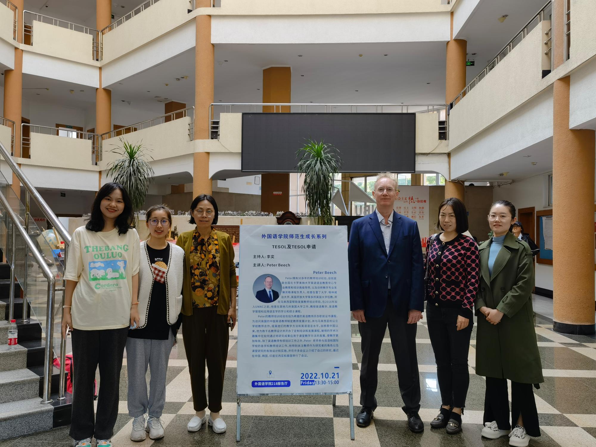 师范生成长系列讲座之“TESOL及TESOL申请”在学院218报告厅举行。现任联合国北卡罗来纳大学英语语言教育中心专业教育和培训高级导师、剑桥语言教学专业发展资格课程负责人Mr.Peter Beech为英语(师范)专业百余名学生带来了本次主题讲座,他介绍了TESOL的最新教学理念及TESOL申请的有关知识。