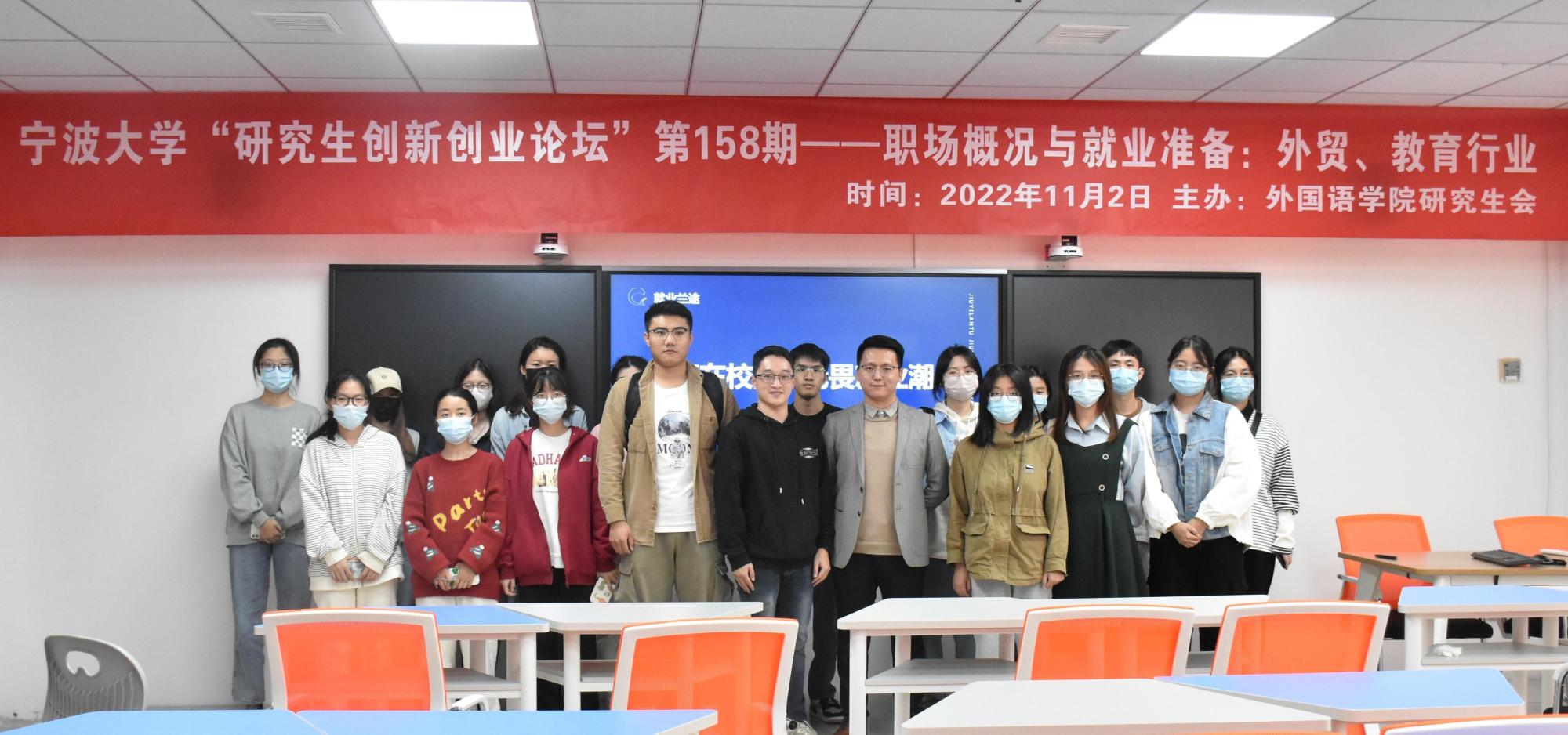 兰浩从毕业前的校园创业经历讲到毕业后在不同领域的职业发展和创业故事,重点讲述了外贸、教育行业的职场概况和就业准备要求。在外贸行业方面,兰浩对国内及宁波市国际贸易行业发展与最新政策进行解读,总结了“246”万千亿产业集群以及他们的代表企业,并对宁波各区县产业分布、中国内地外贸十强城市进行详细剖析,讲述了纯贸易,工贸一体,跨境电商等不同业态的区别,解析了宁波外贸的数据、环境和未来发展目标,并分享了外贸类企业的求职技巧等,为同学们进一步了解外贸行业提供了很多的帮助。兰浩鼓励同学们践行“实践出真知”的道理,除了了解行业状况和企业资讯外,更重要的是去不同类型的企业进行实践,同学间也可多交流,挖掘出专属于自己的职业心得和成长道路。紧接着,兰浩对宁波市私立国际学校以及九年制国内教育学校进行分析,指出国际学校和私立学校的特点和优势,并举例具体的学校进行案例分析,为同学们提供了私立学校求职应聘指南。最后,兰浩先生送上一段话以激励求职创业中的同学:少年何妨梦摘星,敢挽桑弓射玉衡。莫道今朝精卫少,且邀他日看海平。