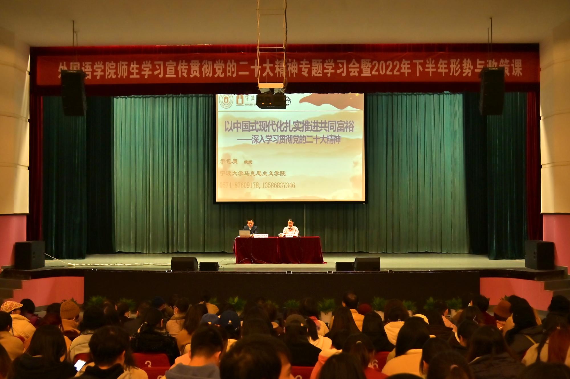 师生学习宣传贯彻党的二十大精神专题学习会暨2022年下半年形势与政策课在林杏琴礼堂开讲。马克思主义学院院长李包庚教授做了题为“以中国式现代化扎实推进共同富裕——深入学习贯彻党的二十大精神”的专题报告。讲座由学院党委负责人主持,学院党政负责人、学生工作负责人和八百余名师生参加讲座。