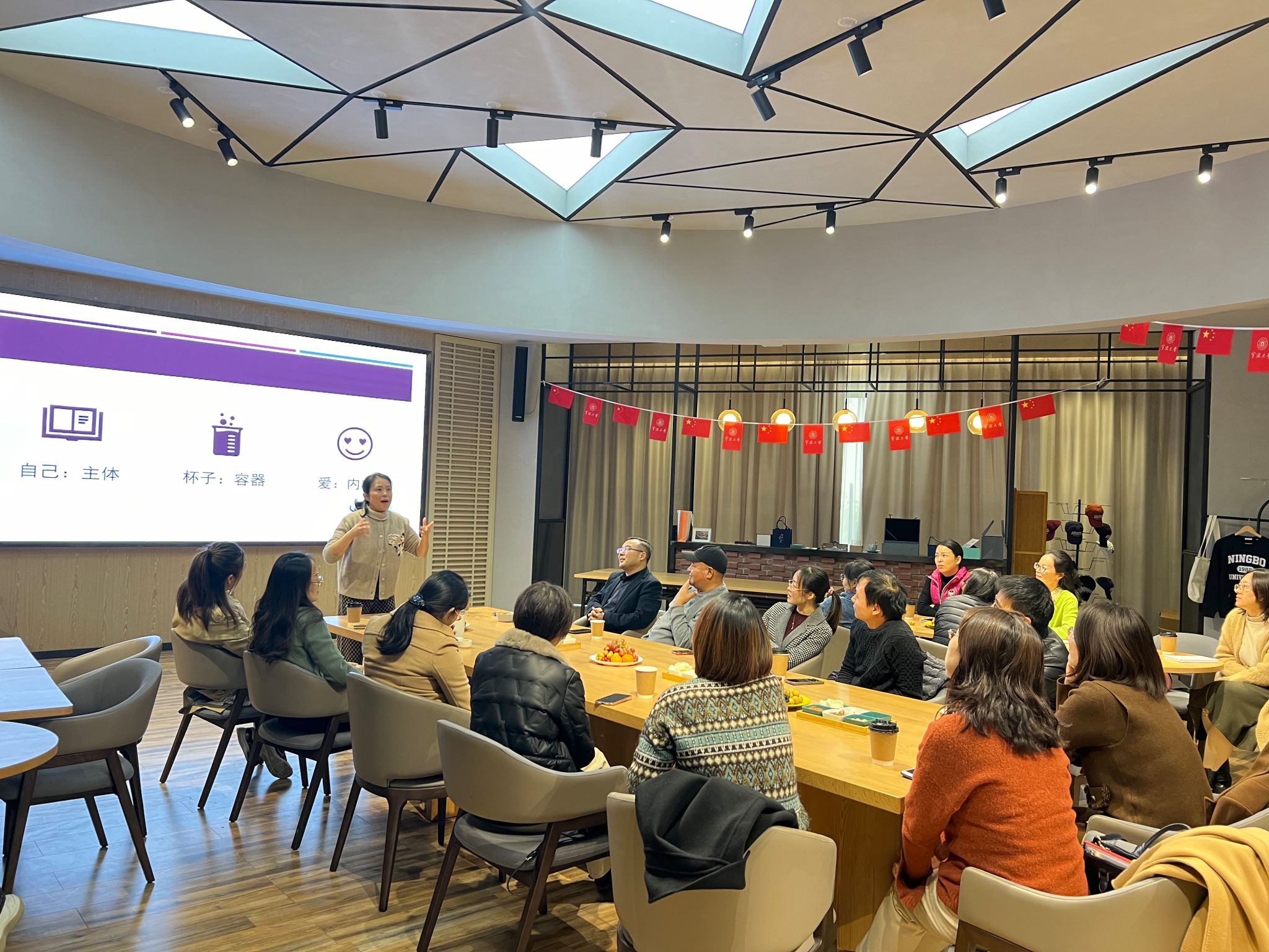 93级英语教育专业校友、国家二级心理咨询师、儿童游戏治疗师、知悦心理工作室创办人廖菁菁受邀为学院班主任、辅导员分享“‘注满自己的杯’——爱人如己,从爱自己开始”专题培训暨心理团体辅导,为老师们带来了一场特别的心灵之旅。