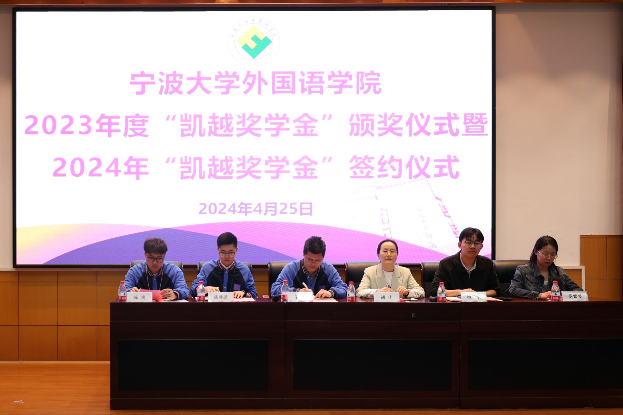 2023年度“凯越奖学金”颁奖仪式暨2024年“凯越奖学金”签约仪式在李达三外语楼218报告厅举行。凯越集团总裁助理、营运事业部董事总经理朱吉,人事部副经理戴陟遥,人事部经理助理陈钱,探花