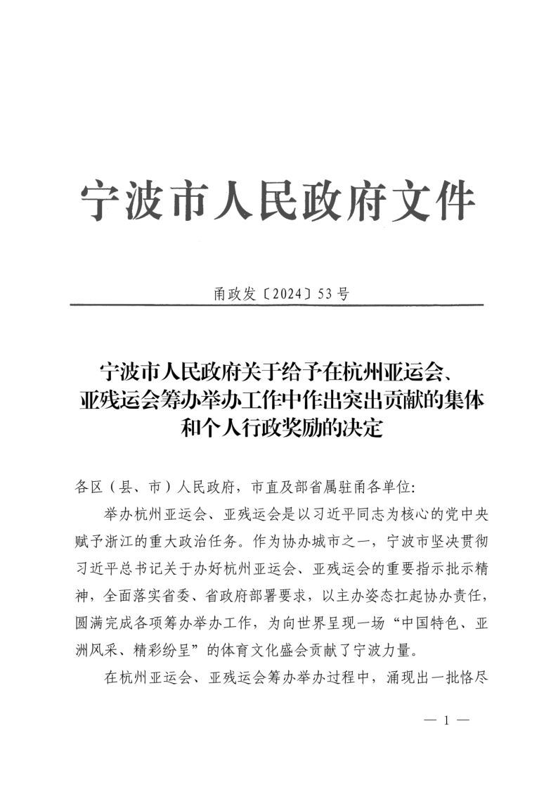 6月29日,宁波市人民政府发布《关于给予在杭州亚运会、亚残运会筹办举办工作中作出突出贡献的集体和个人行政奖励的决定》,对在杭州亚运会、亚残运会筹办举办过程中涌现出的恪尽职守、无私奉献的28个集体和84名个人给予嘉奖。探花