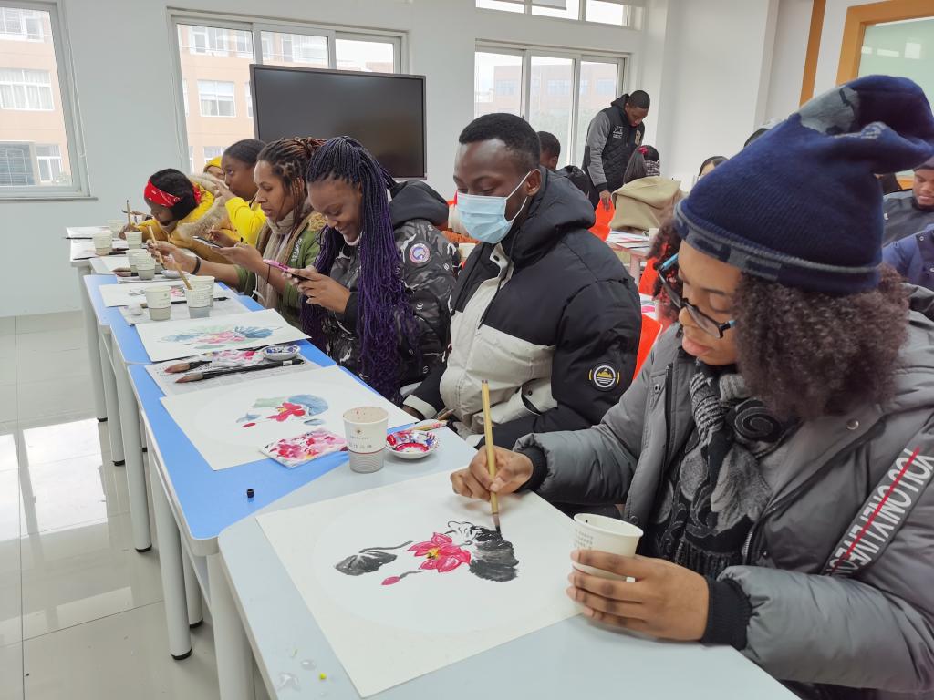 在国画老师的讲解和现场教学下,中外学生用毛笔现场创作国画“莲”,在一笔一墨中融入对清廉思想的感悟。虽然留学生中有不少是初次接触国画,但每一位留学生都热情尝试创作,并在创作过程中体验了中国传统文化的艺术魅力。