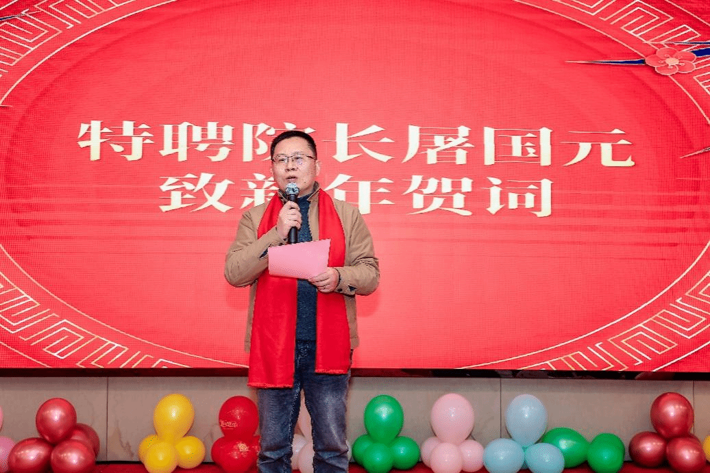 随后,学院特聘院长屠国元发表新年贺词,他向在场的每一位来宾送上了真挚的新年祝福,回顾了学院过去一年的发展与成就,对全体教师的辛勤付出表示衷心感谢,并鼓励大家在新的一年里继续拼搏,为学院的发展再谱新篇。