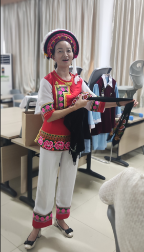 外国语学院是一个多民族融合的大家庭,王锡芬老师来自云南大理白族,她对自己家乡独特的服饰文化深感骄傲和自豪。活动中,她介绍了白族服饰的类型体系、色谱系统与文化特征、文化基因解码以及服饰的现代传承与创新。同时,她讲解了白族服饰材质养形、结构养气、色彩养神、纹饰养心的特殊功能,不同色彩的运用、不同季节的穿搭组合,传统手艺与现代科技的结合,处处展现白族人民对高品质美好生活的追求,体现了“天人合一”的生命观与“物候相谐”的生存智慧,让参加活动的老师们对民族服饰深厚的文化内涵和的蕴藏养生哲学倍感佩服。王老师还带来了白族服装和头饰,现场指导老师进行穿戴,让老师们亲身体验并感受。