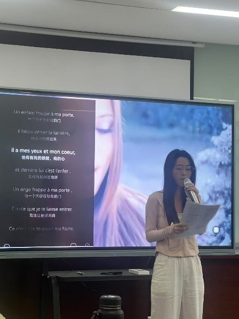 本次沙龙涉及的著作是《天朝遥远》。该著作在一般社会想象意义上研究西方的中国形象,在七个多世纪的中国形象史中,以启蒙运动高潮为分界点,建构出此前不断乌托邦化的三种中国形象类型和此后系统意识形态化的三种中国形象类型。别老师以此书为引,剖析西方视域下的中国形象变迁,从历史误读探讨当代跨文化对话的突破路径。研二施佳雯同学结合此书分享了她的阅读报告,对比中西文明认知差异,引发师生热议。刘彤同学则以法语倾情演绎歌曲,发音精准、情感充沛,获音乐学院周老师的连连称赞。