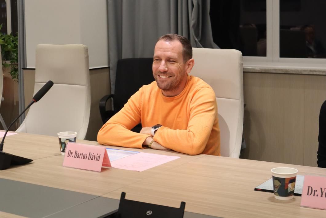 会谈中,罗兰大学文学院院长 Bartus Dávid博士详细介绍了罗兰大学的悠久历史,并重点阐述了其人文学院作为该校第一大学院的显著地位与学科优势。他特别分享了学院在语言学科、人文学科领域的设置,以及这些学科与人工智能、商贸企业融合发展的创新实践。其中,罗兰大学新近开设的“跨文化商务交际”硕士项目引起了与会者的浓厚兴趣。David院长指出,该专业深度融合语言学科与商学学科,旨在培养适应全球化商贸需求的复合型人才,不仅在匈牙利本土发展态势良好,也正积极寻求与海外高校的合作机遇。这一合作方向与宁波大学外国语学院着力发展复合型国际化人才培养模式、积极开拓国际合作办学路径的战略规划高度契合。
