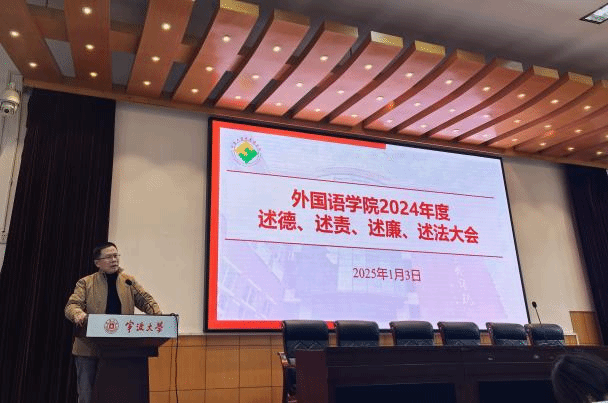 2025年1月3日,外国语学院召开了2024年度党政领导班子述职、述廉、述责、述法大会暨全院教职工大会。特聘院长屠国元和党委书记翁华星在会上做了全面的个人报告,回顾了过去一年学院的各项工作成果,并对2025年工作进行了展望。