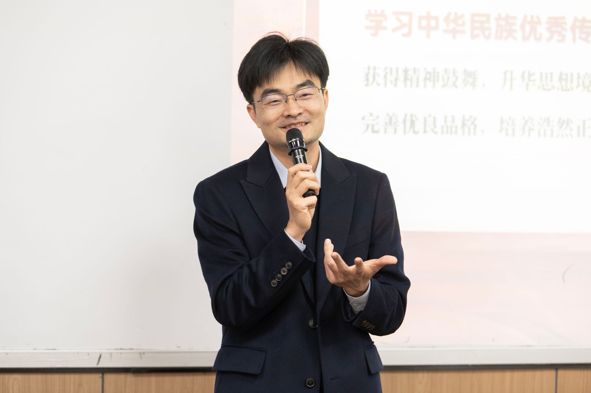 讲座伊始,郭美星博士以“中华文化是生命的学问”开题,从日常生活的细微处切入,以“我们为何从父姓?”这一看似平常的问题开场,在与学生的轻松互动中,生动揭示了姓氏背后所承载的家族传承与文化秩序,引领听众感受文化流淌于血脉之中的温度。他生动阐释了“生生之谓易”的三重境界——生存有道、生活有美、生命有光,并指出这正是传统文化回应个体安顿、社会和谐与生命意义的智慧结晶。通过结合姓氏传承、经典训诂、当代社会心态等丰富实例,郭主任深刻揭示了传统文化并非尘封故纸,而是关乎每个人如何“活着、活好、活出价值”的鲜活指南。