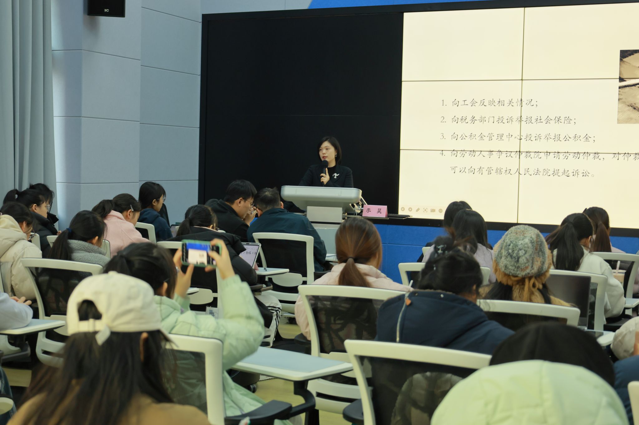 她从大学生求职中最为常见的“实习关系”切入,细致拆解并厘清了实习协议与劳动合同的核心法律区别,重点解读了实习期间权利义务的界定标准及《中华人民共和国民法典》中的相关关键规范。李昊律师结合真实司法案例,对就业、实习全流程中的核心法律条款、履约要求等关键点展开深入解读,着重叮嘱同学们,在求职就业过程中需精准把握法律要点,更要牢固树立契约精神,在签署就业相关约定后,务必严格遵守合同条款,秉持诚信原则践行承诺,为职业生涯筑牢合规诚信根基。
