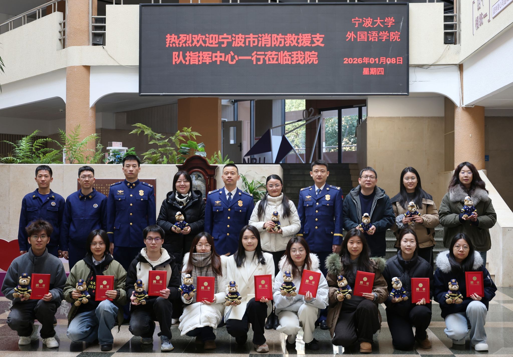 1月8日,宁波大学外国语学院与宁波市消防救援支队指挥中心共建签约暨“社会实践基地”揭牌仪式在外国语学院422会议室举行,宁波市消防救援支队指挥中心主任虢正强、技术干部杨毅及指战员代表、宁波大学外国语学院党委书记翁华星、副院长贺莺、学生工作负责人冯能跃、学工办相关辅导员、语言消防志愿队队员等出席活动。