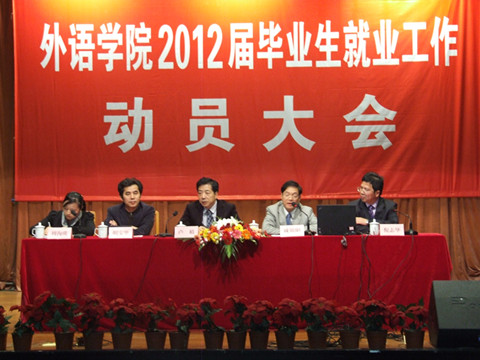 下午15:00,外语学院2012届毕业生就业工作动员大会在锦绣小剧场顺利召开。大会由院党委书记戚锦阳主持,宁波大学学生处副处长胡宝华、院长卢植、院党委副书记倪志华、学工办主任周洵瑛出席此次大会。
