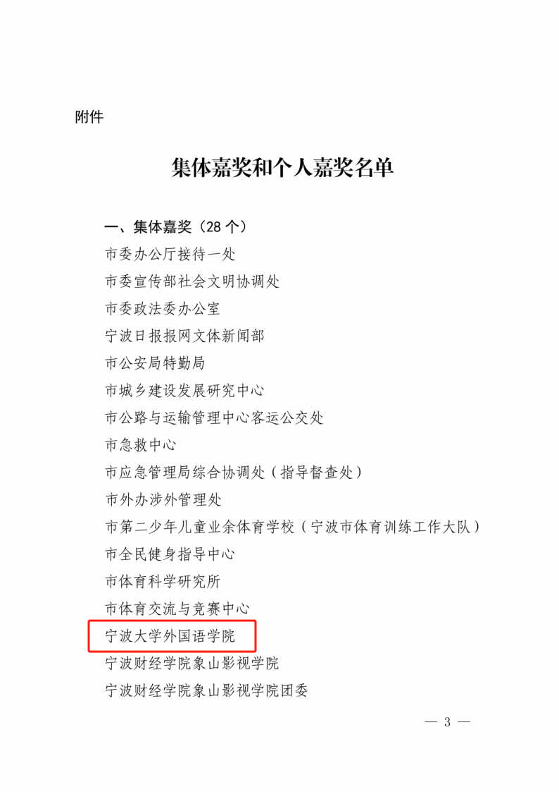 6月29日,宁波市人民政府发布《关于给予在杭州亚运会、亚残运会筹办举办工作中作出突出贡献的集体和个人行政奖励的决定》,对在杭州亚运会、亚残运会筹办举办过程中涌现出的恪尽职守、无私奉献的28个集体和84名个人给予嘉奖。探花