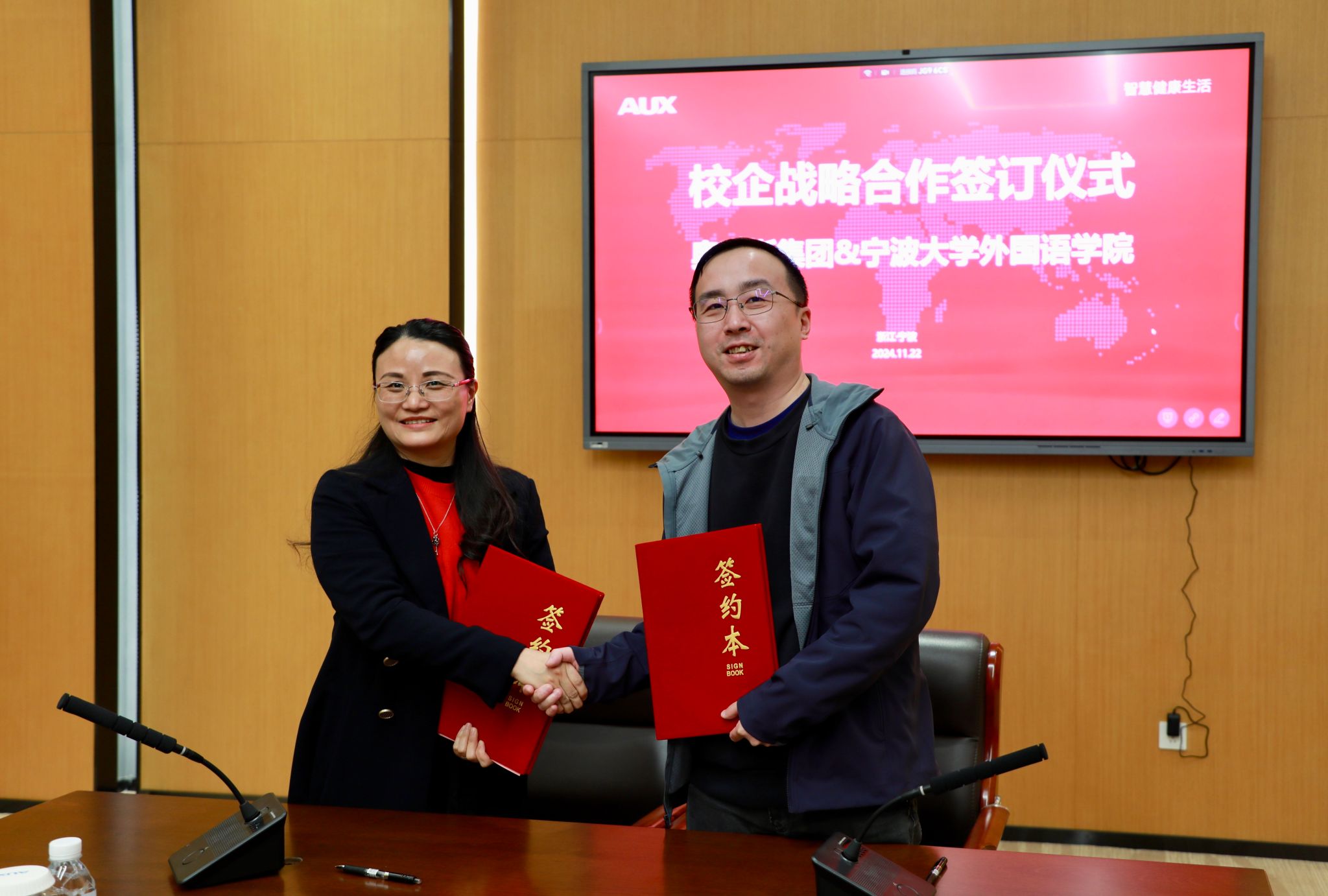 随后,外国语学院党委书记翁华星与奥克斯集团有限公司党委副书记、总裁助理戴冬冬代表校企双方签订校企合作协议。继去年12月份建立实习实践基地后,双方将在人才培养、实习实践、师资交流、项目合作等方面开展进一步深入合作。