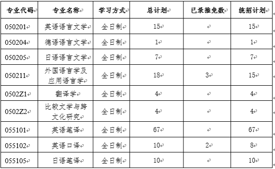 2. 050201英语语言文学、050205日语语言文学、050211外国语言学及应用语言学、0502Z2比较文学与跨文化研究、055101英语笔译、055105日语笔译专业一志愿复试比例为1:1.2,折算后若存在小数点,复试人数按进位计算,最后一名如遇同分,则同分考生全部进入复试。
