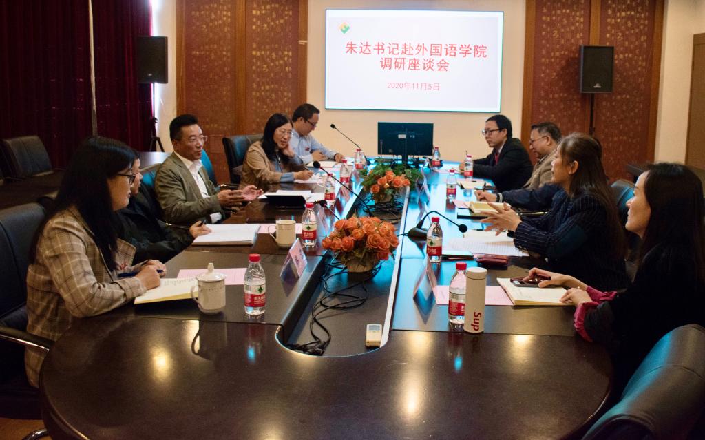 11月5日上午,校党委书记朱达一行到外国语学院开展调研,党校办、研究生院、人事处、人文社科处等相关部门负责人陪同调研,外国语学院党政班子及内设机构负责人参加会议。