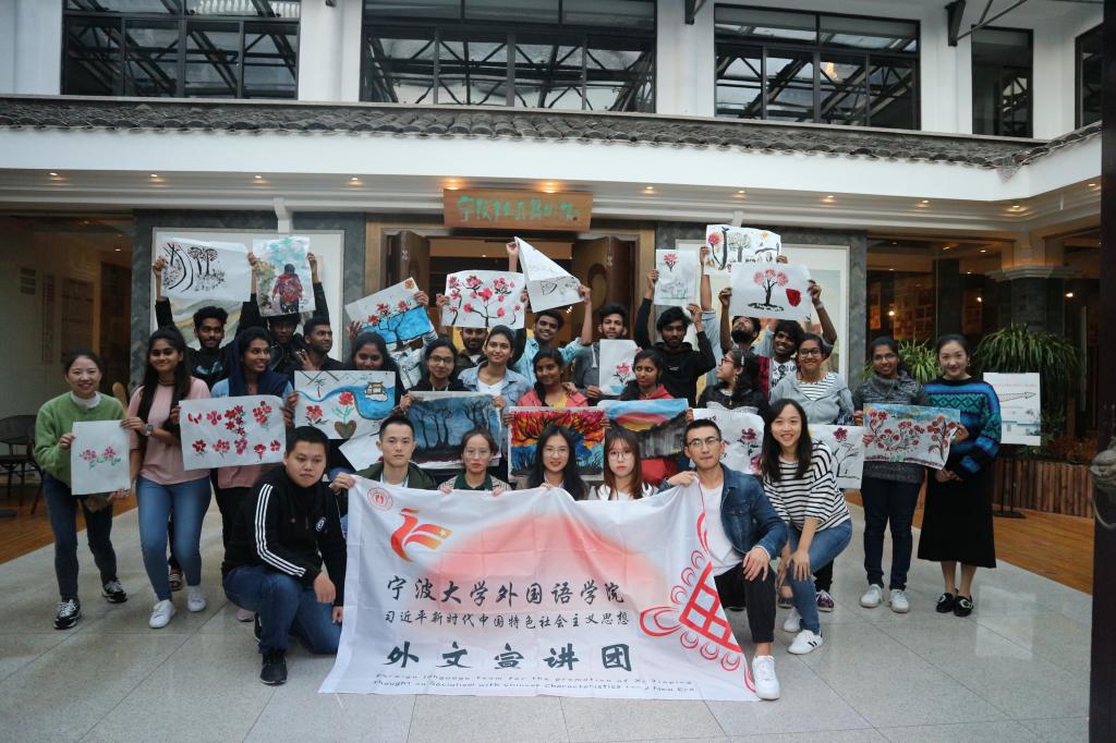 11月9日下午,外国语学院习近平新时代中国特色社会主义思想外文宣讲团走出校园,在古色古香的老外滩李宅开展了“不忘初心 牢记使命”主题教育系列外文宣讲活动之“中国山水 翰墨飘香”宣讲活动,20余名在宁波学习的印度青年参与活动。