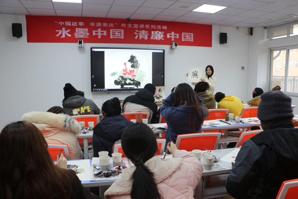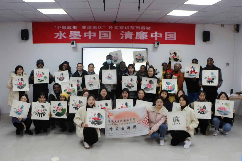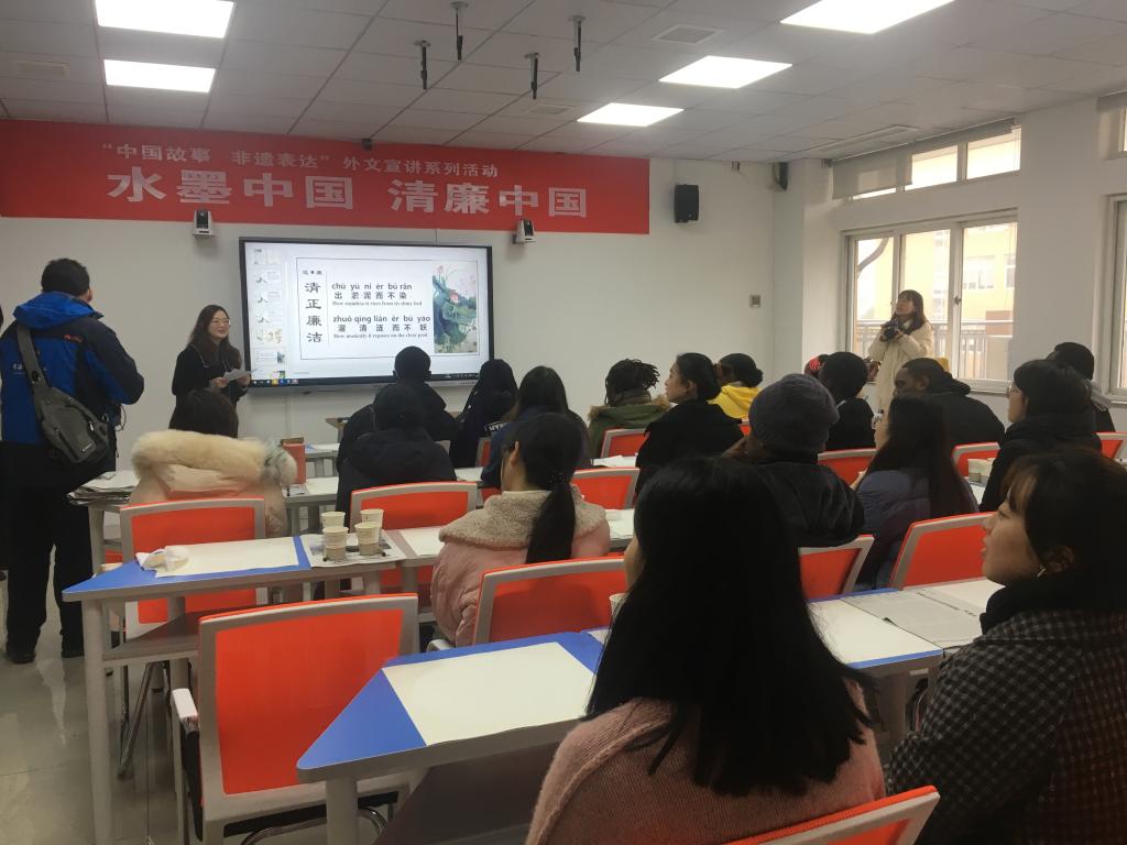 “一身正气如莲洁,两袖清风比荷轻”。12月23日,外国语学院以“水墨中国 清廉中国”为主题,在李达三外语楼举办了一场寓教于乐的外文宣讲系列活动。学院党委负责人、学生工作兼纪委负责人以及中外学生30余人参加了此次活动。