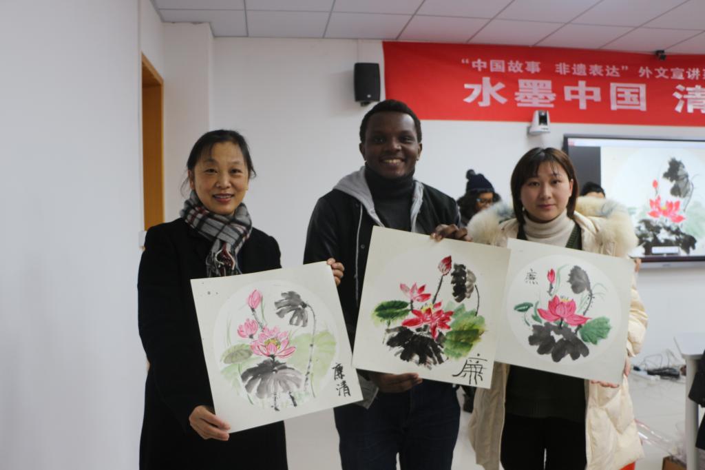 一位来自牙买加的留学生不太会使用毛笔,但在老师的帮助下也成功画出了莲花,这让她很感动;另一位津巴布韦的留学生在绘画中还充分品味了《爱莲说》所要表达的内容,感慨中国清廉文化和传统文化的博大精深。活动结束后,学院党委书记与来自卢旺达的留学生在活动结束后互相交换赠予对方现场绘画的作品。