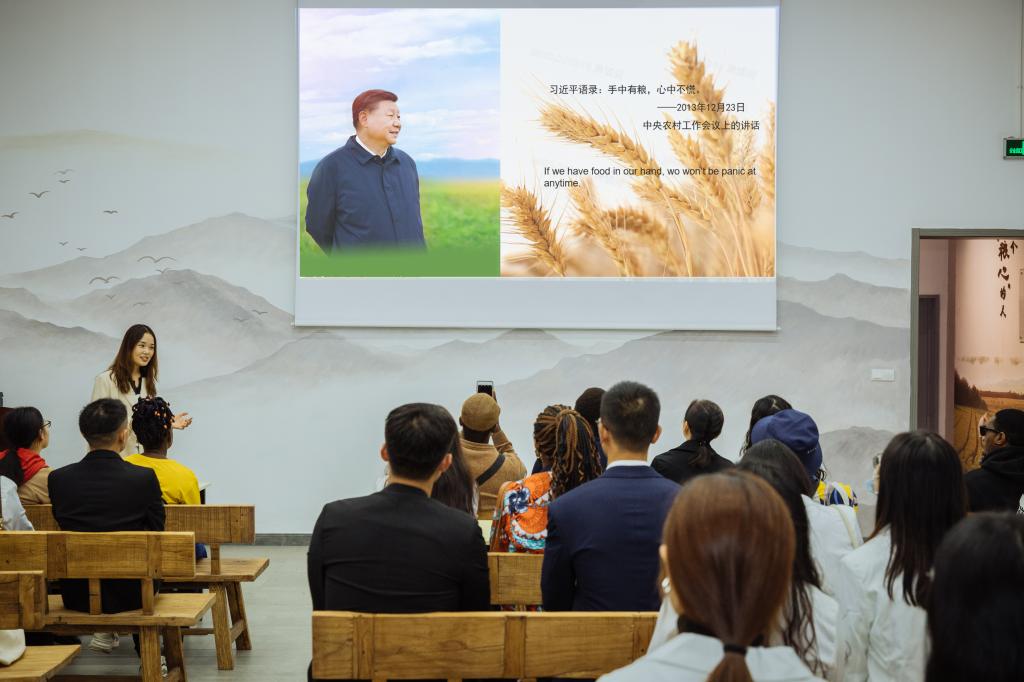 在外文宣讲团的翻译讲解下,留学生们走进中国古代的粮食业发展史,深入了解粮食种植的历史、品种、农耕工具的分类,近代粮食生产、制作、销售及管理的变迁。宣讲团成员着重讲解了新时代中国农业政策、新兴种植技术、机械化生产方式,以及“共和国勋章”获得者、“杂交水稻之父”袁隆平对中国乃至世界杂交水稻事业所作的贡献。随着中国发展进入新时代,中国人的餐桌不断丰富,饮食观念有所变化,国家粮食安全工作也有所加强。正如习近平总书记所讲“手中有粮,心中不慌”,在党和国家对粮食发展的重视下,中国粮食储备充足,人民幸福感油然而生。