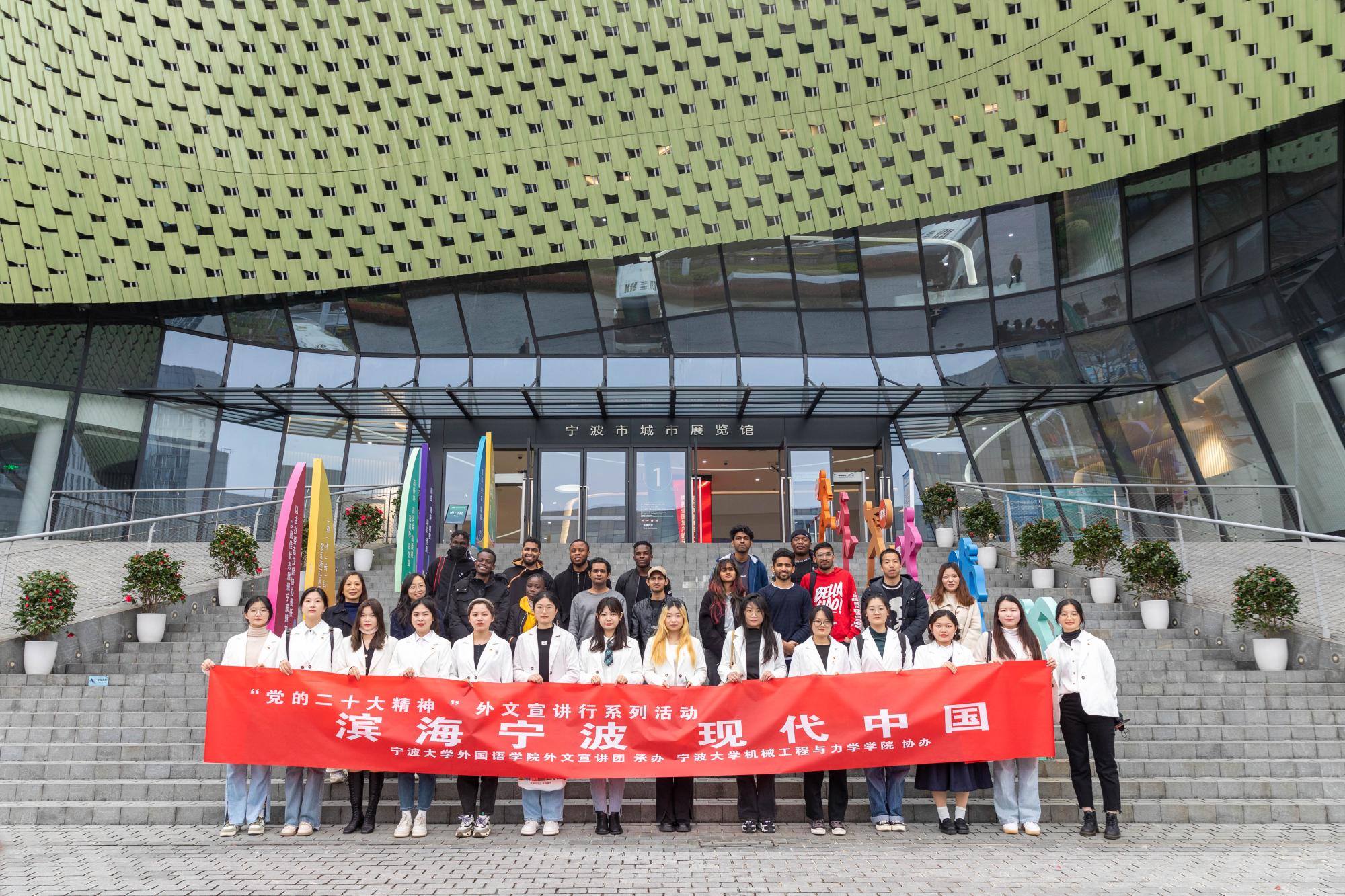 在全国掀起学习“党的二十大精神”热潮之际,宁波大学外国语学院外文宣讲团迎来了一批特别的听众,他们是来自印度、巴基斯坦、津巴布韦等国的在甬留学生。3月23日下午,四十余名中外大学生一同走进宁波城市展览馆,沉浸式了解宁波城市发展的过去、现在和未来,深入感悟中国式现代化的理念。