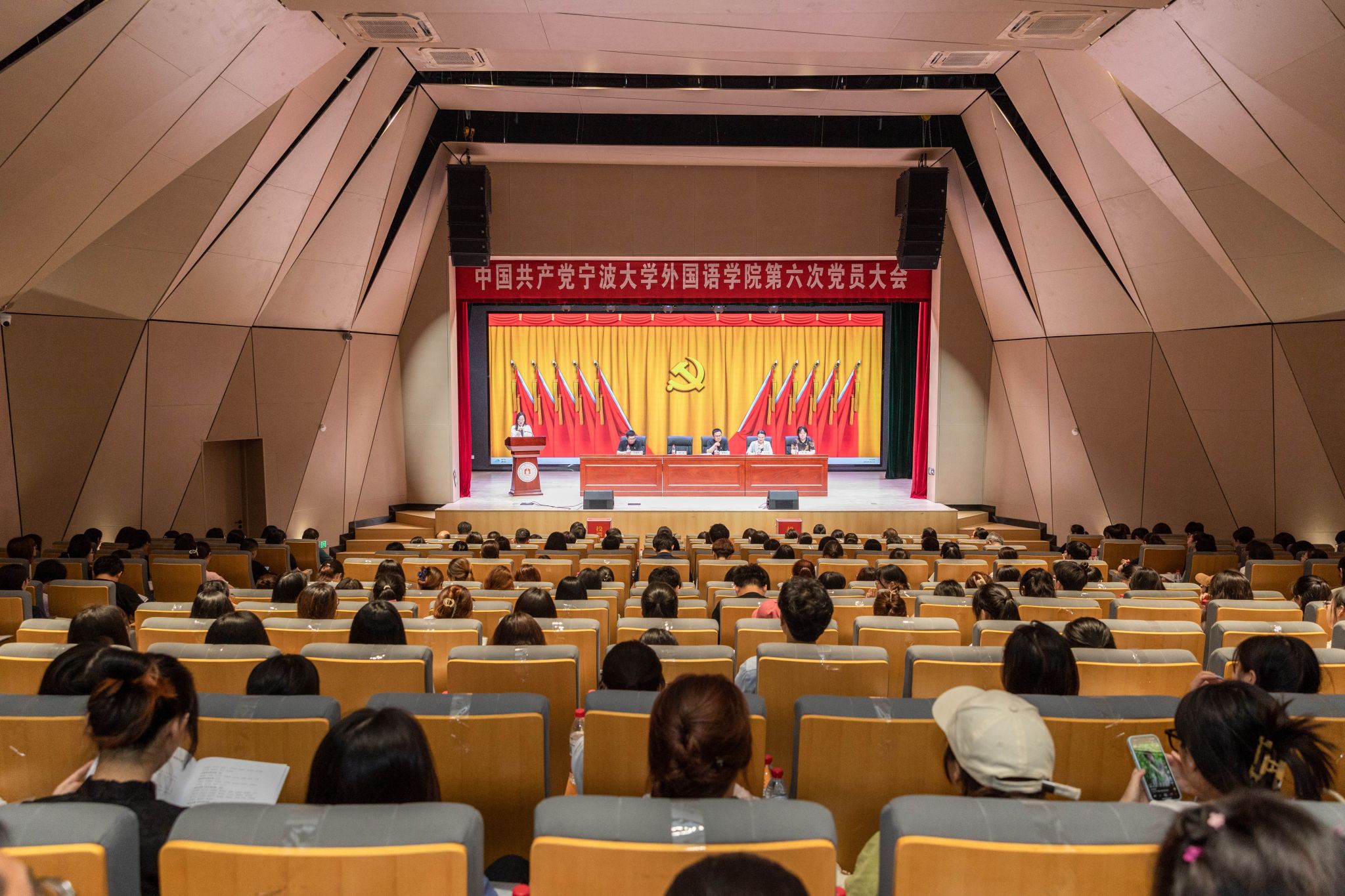 6月21日下午,中国共产党宁波大学外国语学院第六次党员大会在锦绣小剧场隆重举行。会议由学院党委副书记、纪委书记胡佳主持,学院全体师生党员参加,学校考察组成员全程列席。