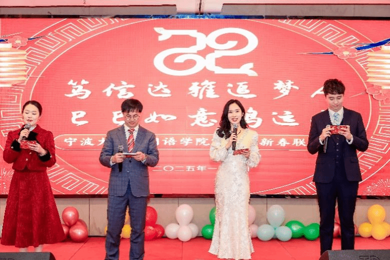 1月10日,腊月初六,宁波大学外国语学院迎春联欢会在赛思食府二楼赛思厅成功举办。此次活动由外国语学院党委主办,外国语学院分工会、外国语学院学工办以及外国语学院校友会承办。由96届英语系校友胡英杰、学工办施嘉婷、学工办景颢、德语系王婉赢主持。外院在职教职工、离退休教师和校友会的众多成员齐聚一堂,共迎新年。