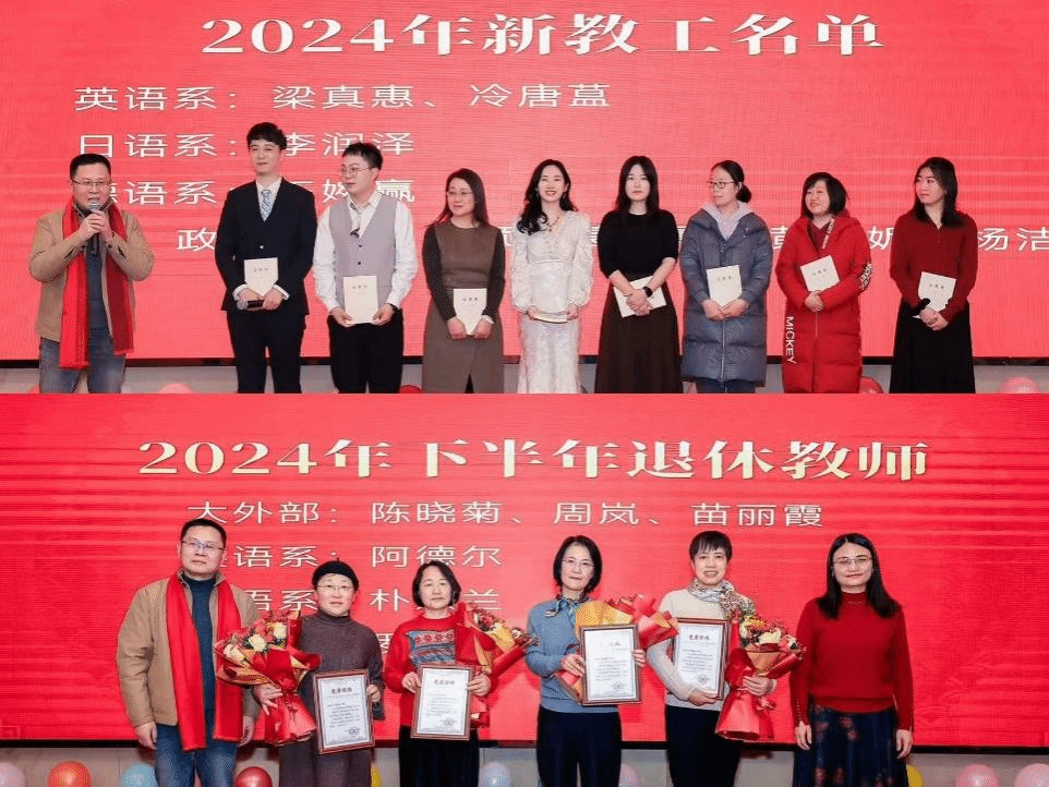 除了文艺表演,晚会还举办了2024年下半年退休教师荣休仪式以及2024年新教工入职仪式,学院以隆重而温馨的方式,向退休教师们多年来为学院发展所做出的贡献表达了崇高敬意和诚挚感谢,也让新教师们感受到了学院大家庭的温暖与关怀,体现了外国语学院的人文关怀。