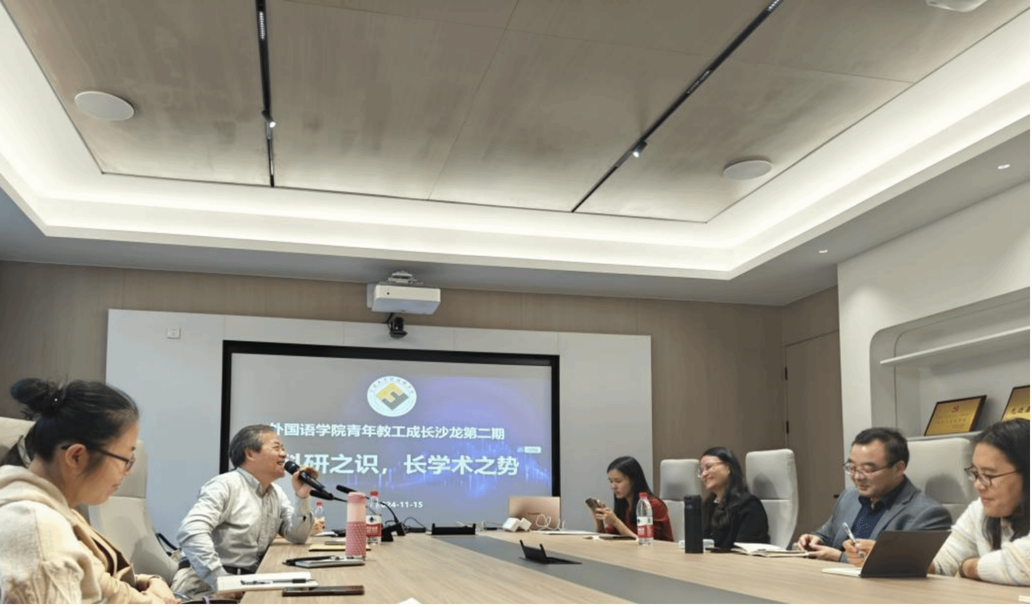 随着新时代教育的发展和课程改革的不断深入,教学科研能力已经成为教师教书育人过程中的又一项必备技能。为进一步激发外国语学院青年教师科研热情,提升青年教师科研能力,2024年11月15日,外国语学院分工会举办了“增科研之识,长学术之势---第二期青年教工成长”主题沙龙活动。学院特邀请校人文社科处应姗姗副处长、外国语学院关工委委员杨成虎教授联袂主讲。活动由外国语学院分工会主席李昌标主持,学院党委书记翁华星及学院各个专业近30位青年教师代表参加。