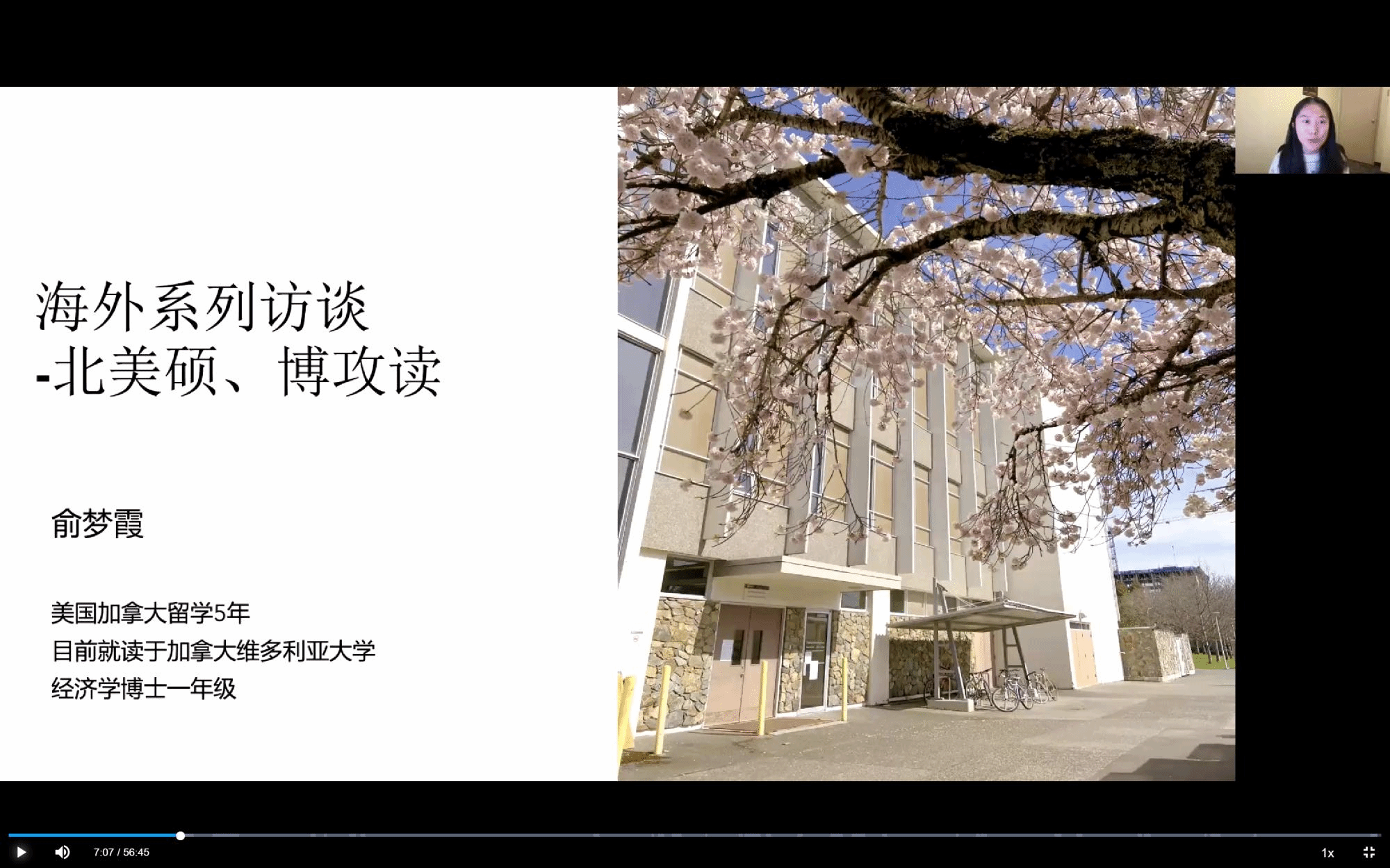 主讲人俞梦霞毕业于宁波大学国际经济与贸易专业,后赴美国和加拿大攻读硕士学位,先后在美国康涅狄格大学读金融风险管理专业和维多利亚大学读经济学专业。目前就读于加拿大维多利亚大学,经济学博士一年级,科研方向包括金融经济学、绿色金融、环境经济学、虚拟货币等。