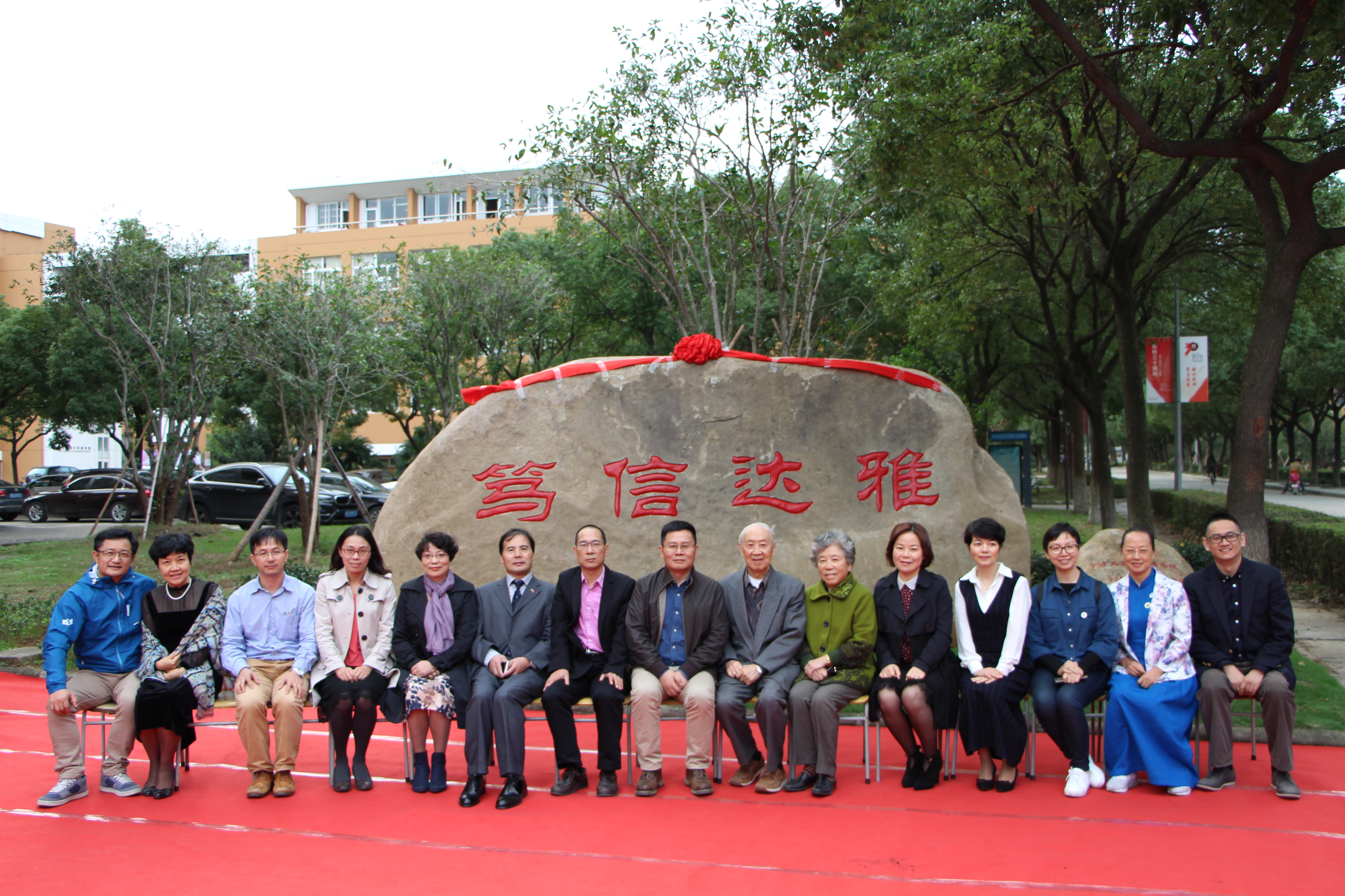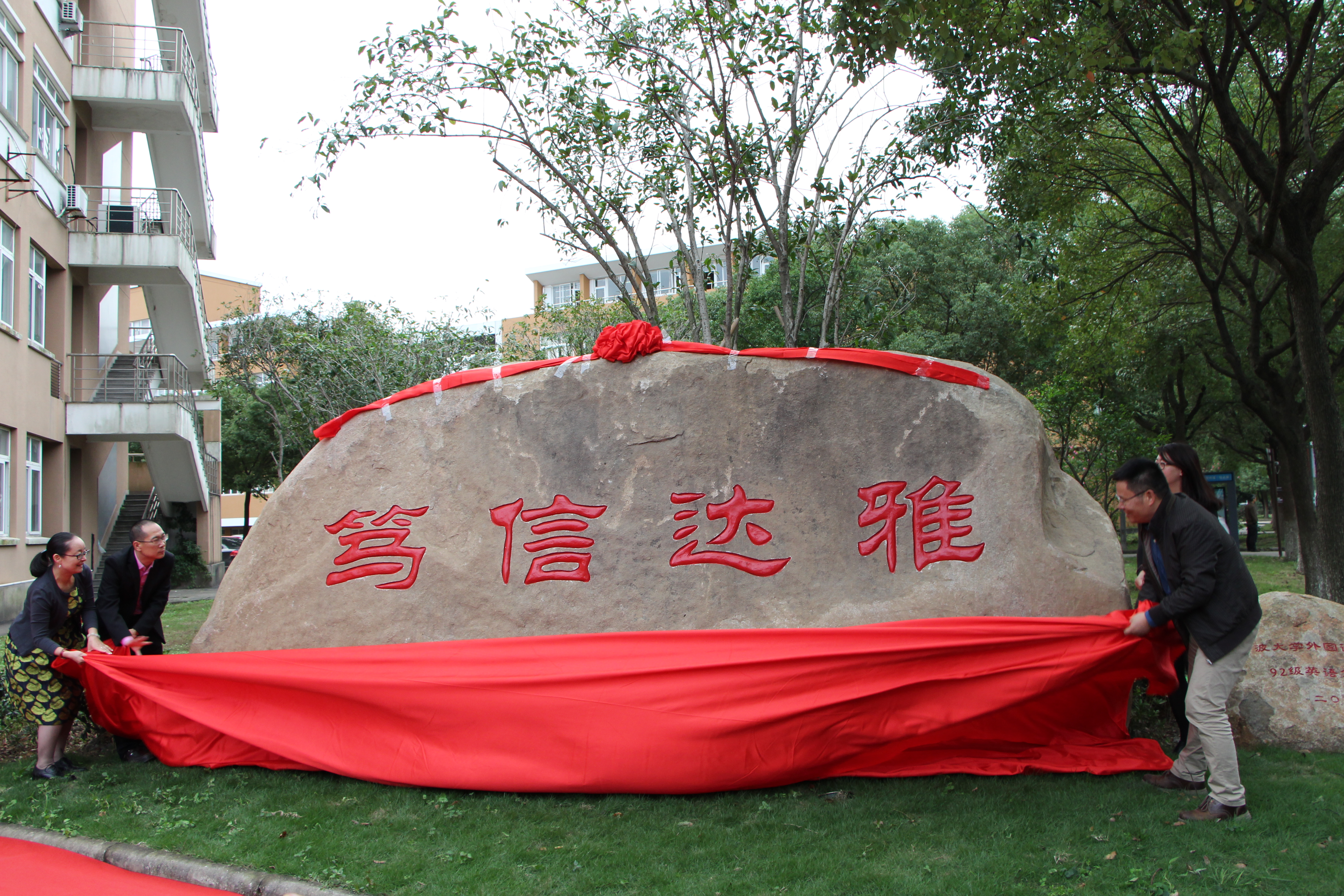 16点,外国语学院“笃信达雅”院训石揭幕仪式在学院小广场举行。学院领导班子成员、原外语系系主任胡荣昌、原外语系退休教师冯韵芳、各届校友代表以及学院师生代表参加揭幕仪式。院长屠国元致辞,介绍“笃信达雅”院训的来历和寓意并对捐赠院训石的学院1992级英语全体校友表示感谢;学院党委书记段汉武介绍了院训石捐赠过程;1992级英语校友胡英杰代表全体校友发言;最后屠院长、段书记以及两名92级英语的校友代表为“笃信达雅”院训石揭幕,并在院训石前合影留念。
