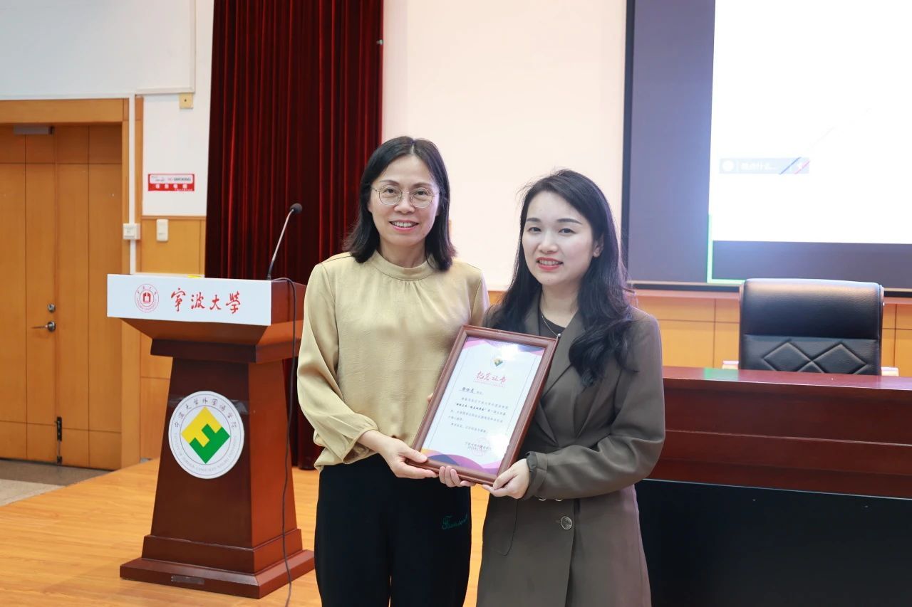 外国语学院英语系副主任、师范专业负责人李奕在讲座结束后为徐玲灵校友颁发了纪念证书,感谢徐玲灵校友在百忙之中回到母校,为母校同学们分享经验、提出专业性建议。