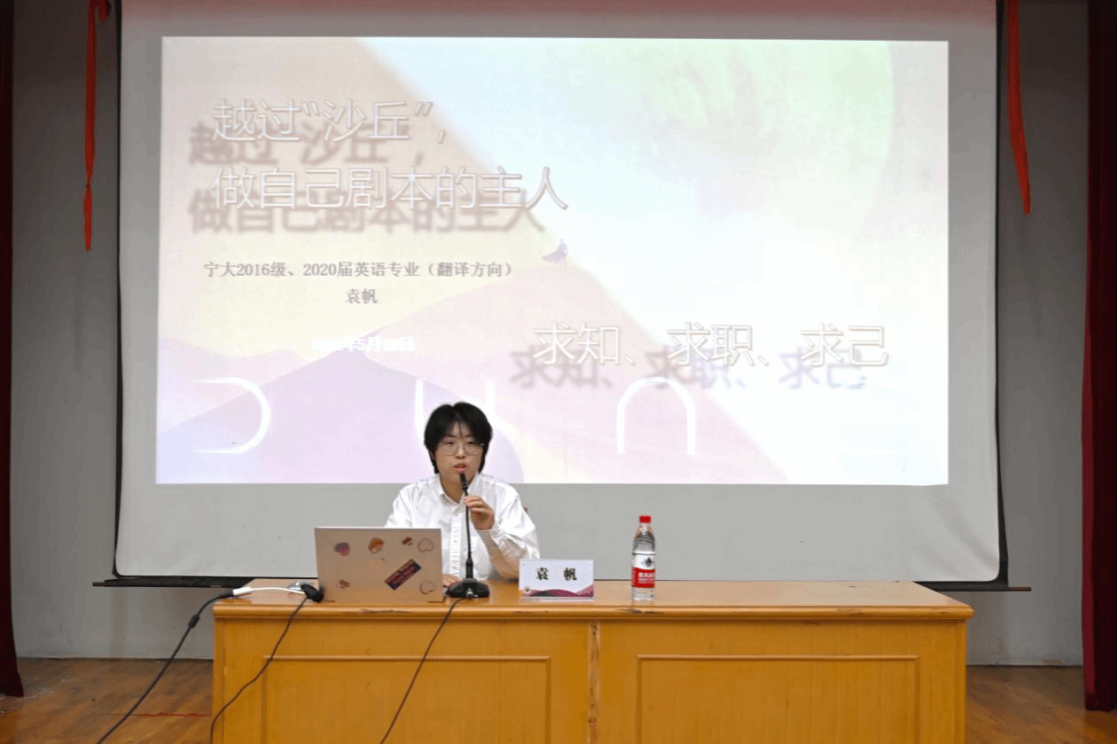 讲座伊始,袁帆以《沙丘》电影情节引入,提出“自己要书写自己的剧本”。她从“求知、求职、求己”三个方面向同学们进行分享。她从个人求学经历、求职考公过程出发,分享了在竞赛备考与亚运会活动中的心得体会。在“求知”中,她建议同学们建立“长期性、持续性准备,将碎片转化为系统”,抓住机遇,“以滚雪球的方式积累经验”,体验生活,“从社团、志愿等课外活动中学习技能”。在“求职”中,她将职业生涯规划融入到主题中。从自身出发,鼓励外语学子职业不设限,运用语言本领,拓宽思路,广泛体验,运用好“语言+”的能力,从个人家庭背景、价值性格等方面选择合适自己的岗位,适应新环境,调整好心态。在“求己”中,她认为,“人生不是到达山顶,而是越过山丘”,需要将自己投射到未来去关照当下,适度反思,允许在山腰处休息蓄力,奔赴下一段旅程。最后,袁帆还向学弟学妹们细致地分享了学习和求职的“干货”,并鼓励大家“做自己,成为想成为的人,去想去的远方”。
