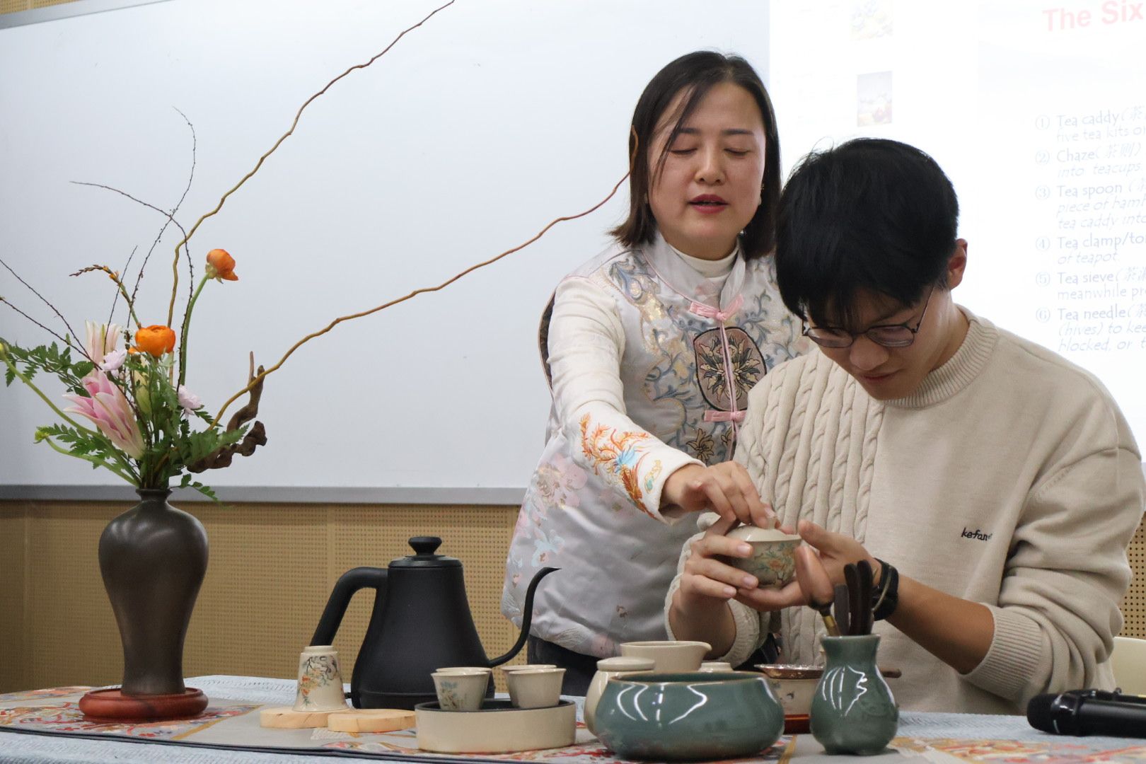 文化作为人类永恒的精神内核,跨越了时间的长河,成为连接过去与未来的桥梁。活动伊始,林艳副教授以儒家哲学为基础,解读了中国茶艺当中的礼仪文化及中华民族精神,她还亲自进行了茶艺展示,动作优雅流畅,赢得了在座师生的阵阵掌声。林艳副教授表示,茶艺不仅是一种技艺的锤炼,更是一场心灵的洗礼。“在泡茶与品茶的细腻过程中,我们学会了静待时光,于细微处体悟生活,培养出了持之以恒的耐心与洞察入微的细心。同时,它也让我们懂得了对自然的敬畏、对传统的尊重,在茶香袅袅中,领悟到为人处世的哲理。”