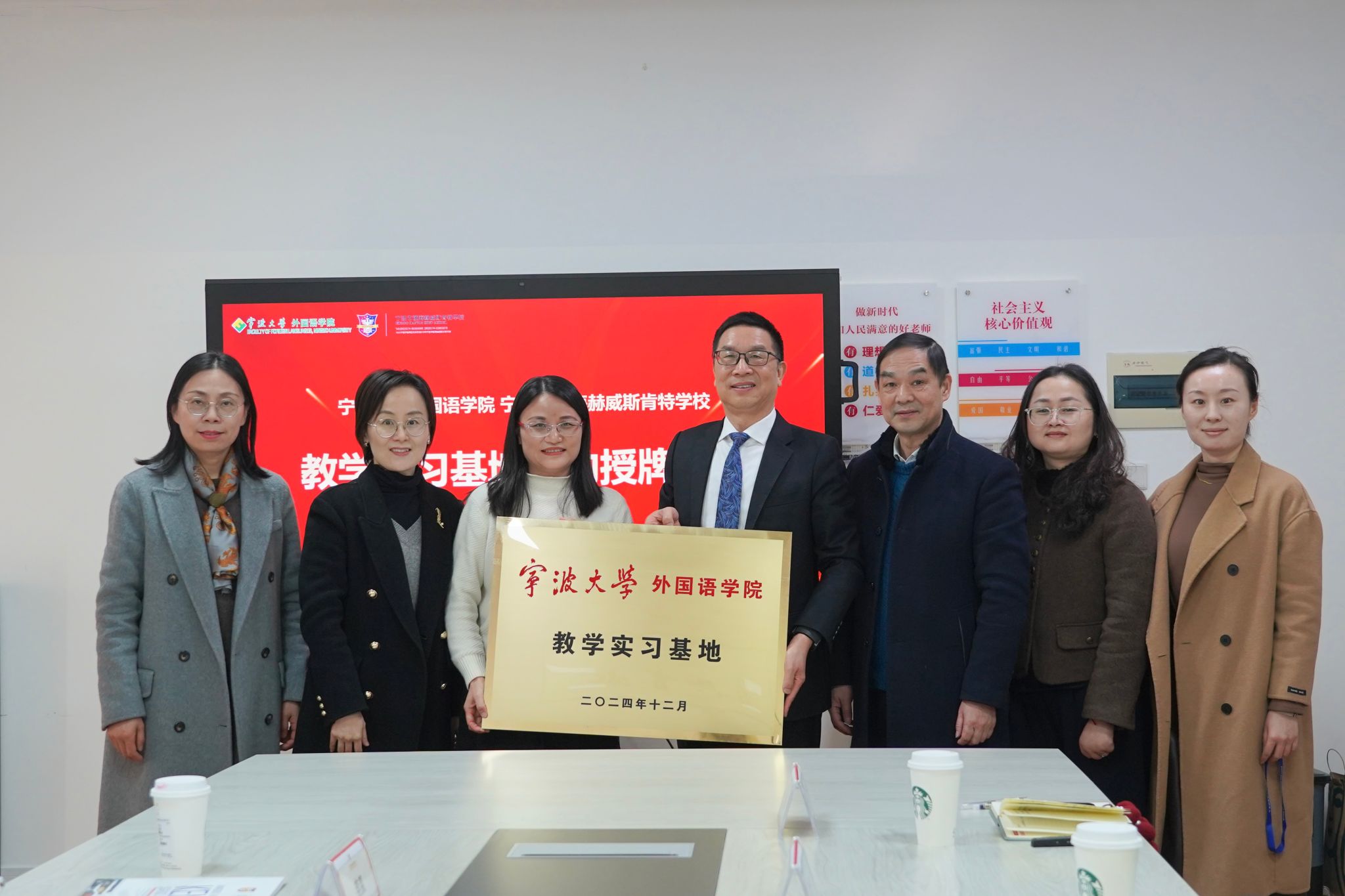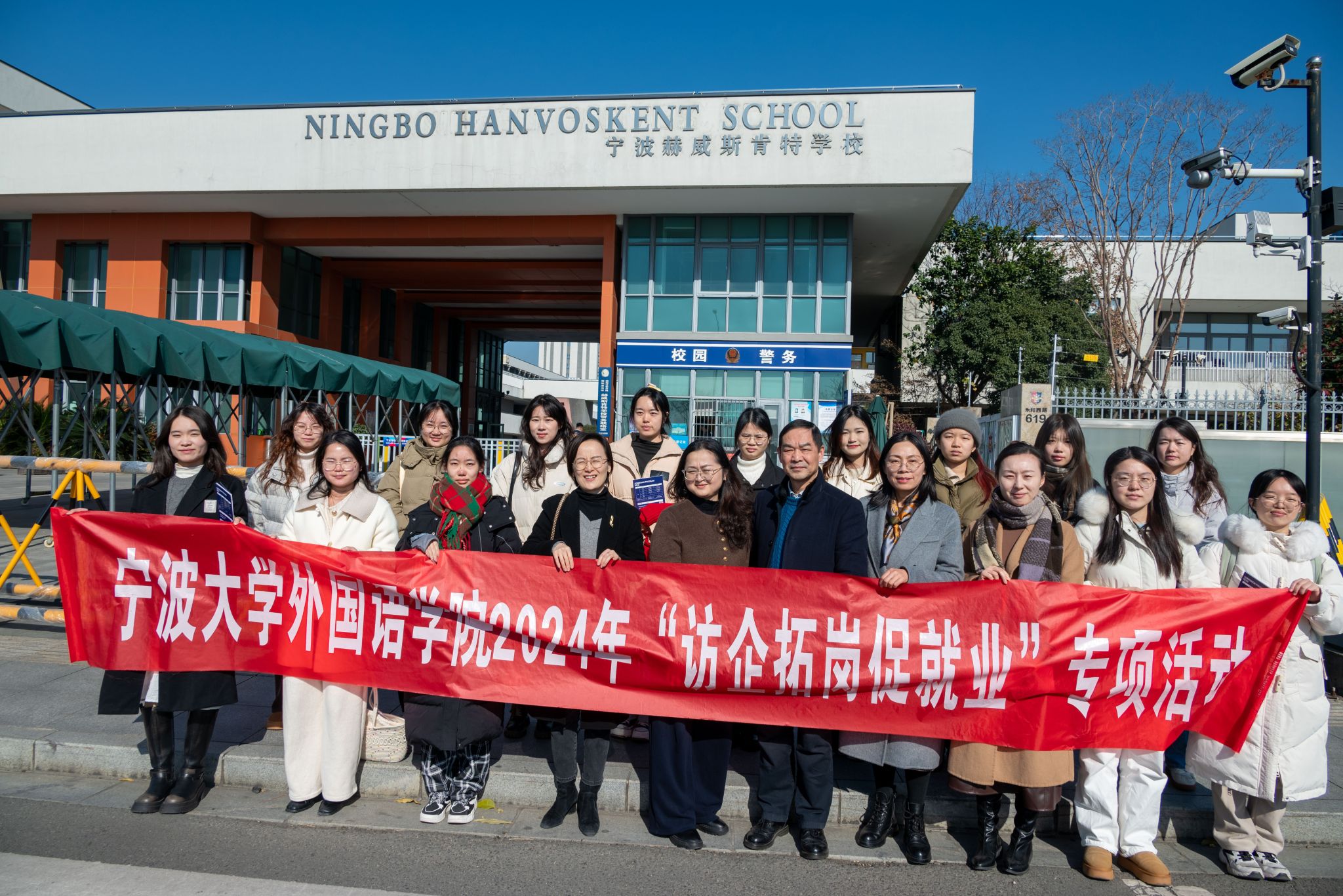 12月29日上午,外国语学院党委书记翁华星、党委副书记胡佳、英语系副主任李奕、学生代表等二十余人赴宁波市镇海赫威斯肯特学校开展“访企拓岗促就业”专项活动。宁波市镇海赫威斯肯特学校校长徐未华、副校长舒建东、校办主任杨晶、校办副主任陈瑶亲切接待。双方签署战略合作协议,并进行教学实习基地授牌仪式。