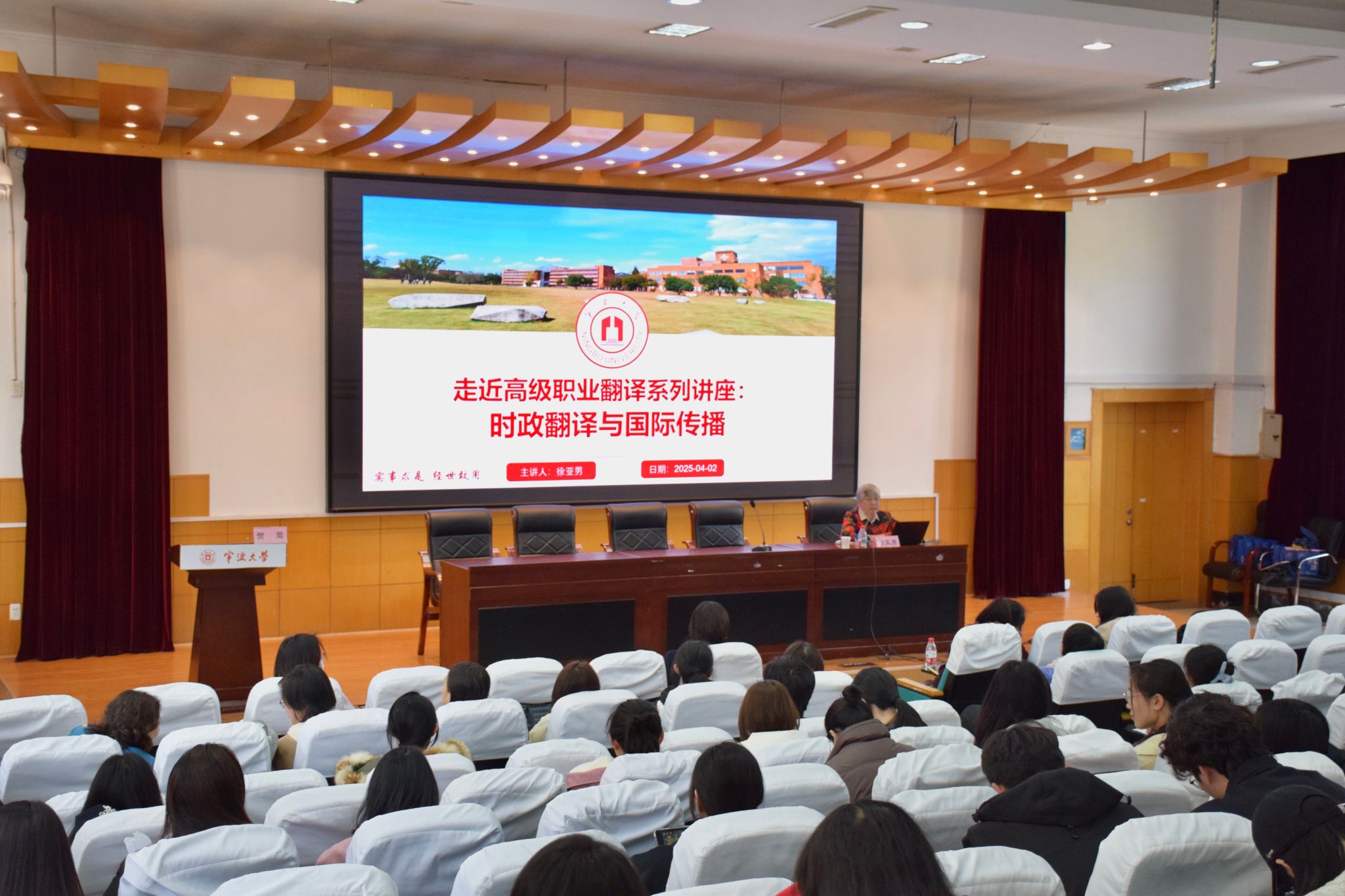 4月2日,应宁波大学翻译硕士教育中心邀请,徐亚男大使做客“走近高级职业翻译系列讲座”,就“时政翻译与国际传播”与师生们进行了深度交流。讲座由外国语学院副院长贺莺教授主持。我院十余位教师及翻译硕士研究生近200人参加讲座。