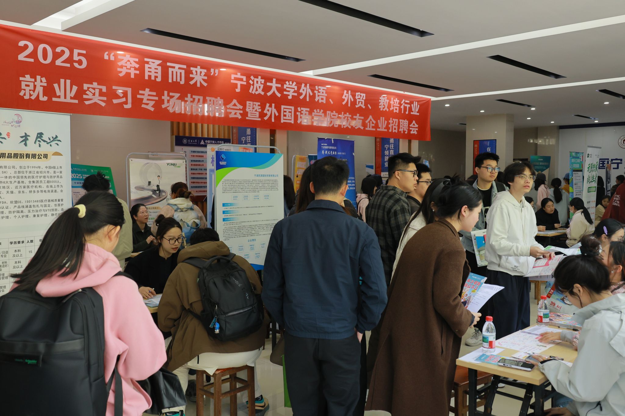 4月2日下午,2025“奔甬而来”宁波大学外语、外贸、教培行业就业实习专场招聘会暨外国语学院校友企业招聘会在宁波大学就业市场顺利举办。