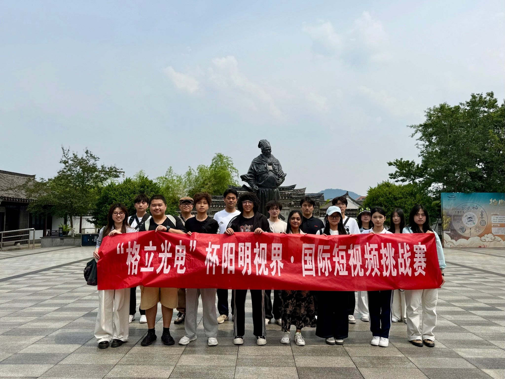 何展展秘书长带领参赛学生前往王阳明故居进行参观与拍摄创作。在实地拍摄过程中,学生们充分发挥专业优势,部分小组与国际留学生交流创作灵感,探讨如何更好地展现阳明故居的历史底蕴与文化内涵。各小组以独特的视角,将阳明文化的精髓融入短视频创作,用镜头记录下承载着历史记忆的角落,为本次比赛和日后阳明文化海外传播积累素材。