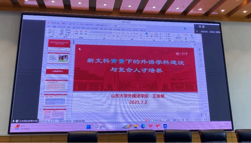 教育部外语类专业教学指导委员会委员、全国新文科教育研究中心副主任、山东大学外国语学院王俊菊教授应邀为我院带来题为《新文科背景下的外语学科建设与复合人才培养》的主旨报告。作为全国新文科建设的前沿阵地,山东大学外国语学院近年来在跨学科研究、人才培养模式创新等领域成果斐然。报告中,王俊菊教授立足新文科建设的时代命题,结合自身丰富的理论研究与实践经验,深入探讨外语学科发展与教育改革路径。王俊菊教授着重介绍了山东大学复合型外语专业建设中的新思路与新模式,对我院的专业转型发展与人才培养极具借鉴和指导意义。