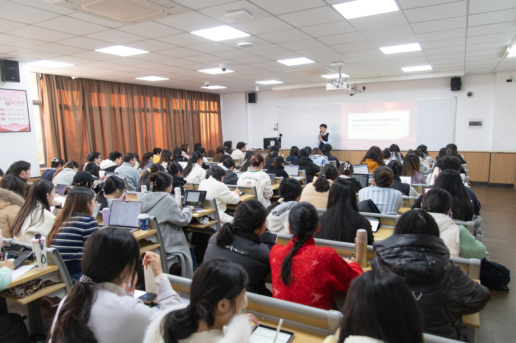 讲座伊始,郭美星博士以“中华文化是生命的学问”开题,从日常生活的细微处切入,以“我们为何从父姓?”这一看似平常的问题开场,在与学生的轻松互动中,生动揭示了姓氏背后所承载的家族传承与文化秩序,引领听众感受文化流淌于血脉之中的温度。他生动阐释了“生生之谓易”的三重境界——生存有道、生活有美、生命有光,并指出这正是传统文化回应个体安顿、社会和谐与生命意义的智慧结晶。通过结合姓氏传承、经典训诂、当代社会心态等丰富实例,郭主任深刻揭示了传统文化并非尘封故纸,而是关乎每个人如何“活着、活好、活出价值”的鲜活指南。