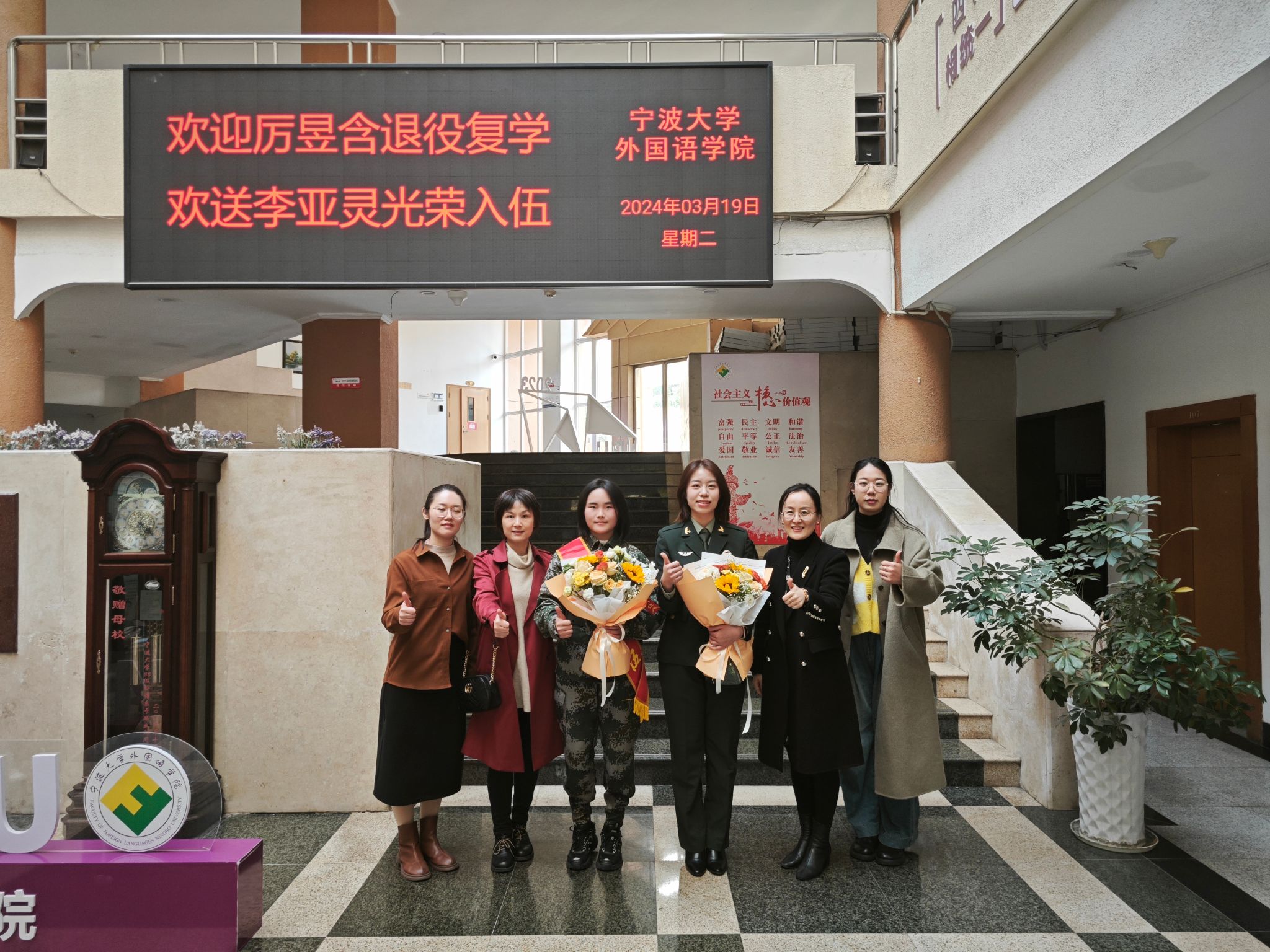随后,两位女兵的班主任、辅导员和同学纷纷送上祝福、表达不舍,并赠予她们鲜花和用心准备的礼物,现场气氛热烈、感人至深。学院党委副书记胡佳充分肯定了厉昱含服役期间的优异表现,也为李亚灵勇敢追梦并选择到边疆地区服役而感到骄傲。讲话中,她对厉昱含提出三点希望,一是继续保持部队优良作风,退伍不褪色,发挥更大的榜样引领作用;二是在学习上保持坚定的信念,做好生涯规划,以饱满的热情加快追赶学业目标;三是课余时间发挥余热,以军人本色和高度的责任感服务校园和社会。同时,她也为新兵李亚灵在进入军营后即将面对的挑战和磨砺加油鼓劲,希望李亚灵能够在部队里严格要求自己,时刻不忘自己宁大人的身份,发挥优势、补齐短板,同时保重身体,保持与学院师生的联系;她也希望2022级英语(师范)班全体同学以李亚灵为榜样,不断追求卓越,在不久的将来投身国家重大项目。