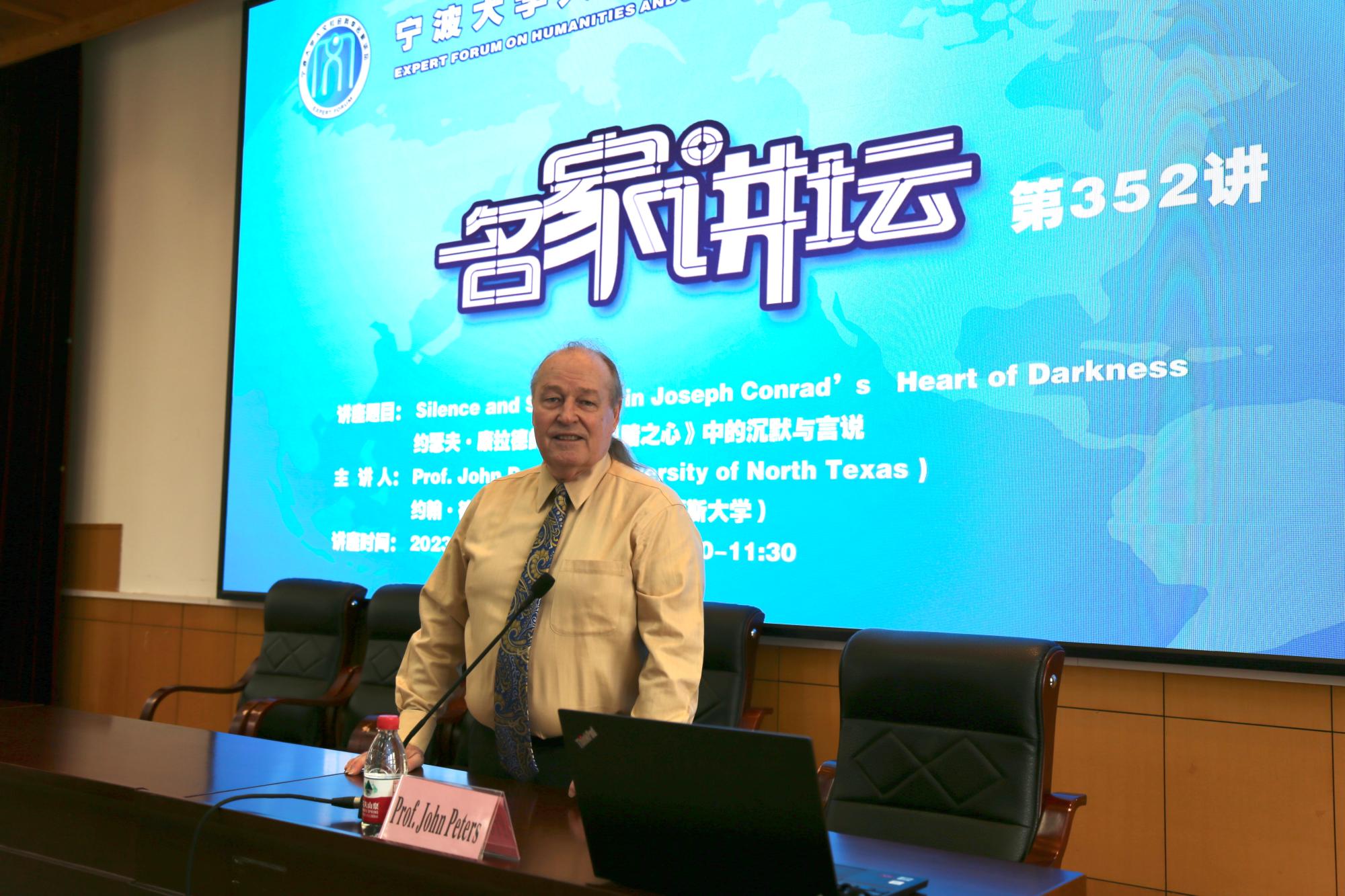 2023523日上午,应宁波大学外国语学院的邀请,美国北德克萨斯大学杰出教授约翰·彼得斯(John Peters)为我院师生作了题为“约瑟夫·康拉德的小说《黑暗之心》中的沉默与言说”(Silence and Speaking in Joseph Conrad's Heart of Darkness)的学术报告。本次讲座由王松林教授主持,外国语学院教师以及本科生和研究生逾百人聆听了讲座。