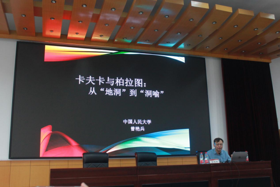 讲座伊始,曾艳兵教授回顾了疫情期间他本人的“地洞式”写作的经历,追溯了卡夫卡“地洞式”写作的缘起,进而阐释了卡夫卡的作品与柏拉图“洞喻说”的联系。接着,曾教授对柏拉图的“洞喻说”进行了细致而深刻的阐述,指出“洞喻说”其本质关涉心灵转向问题。曾艳兵教授引经据典,从柏拉图的 “洞喻说” 到鲁迅的“铁屋子”之说,从《金刚经》的“性空幻有”到海德格尔对人的本质的追问,显示了宽广的学术视野和深厚的学术底蕴。整场讲座深入浅出,风趣幽默,观点令人耳目一新,在场师生获益良多。